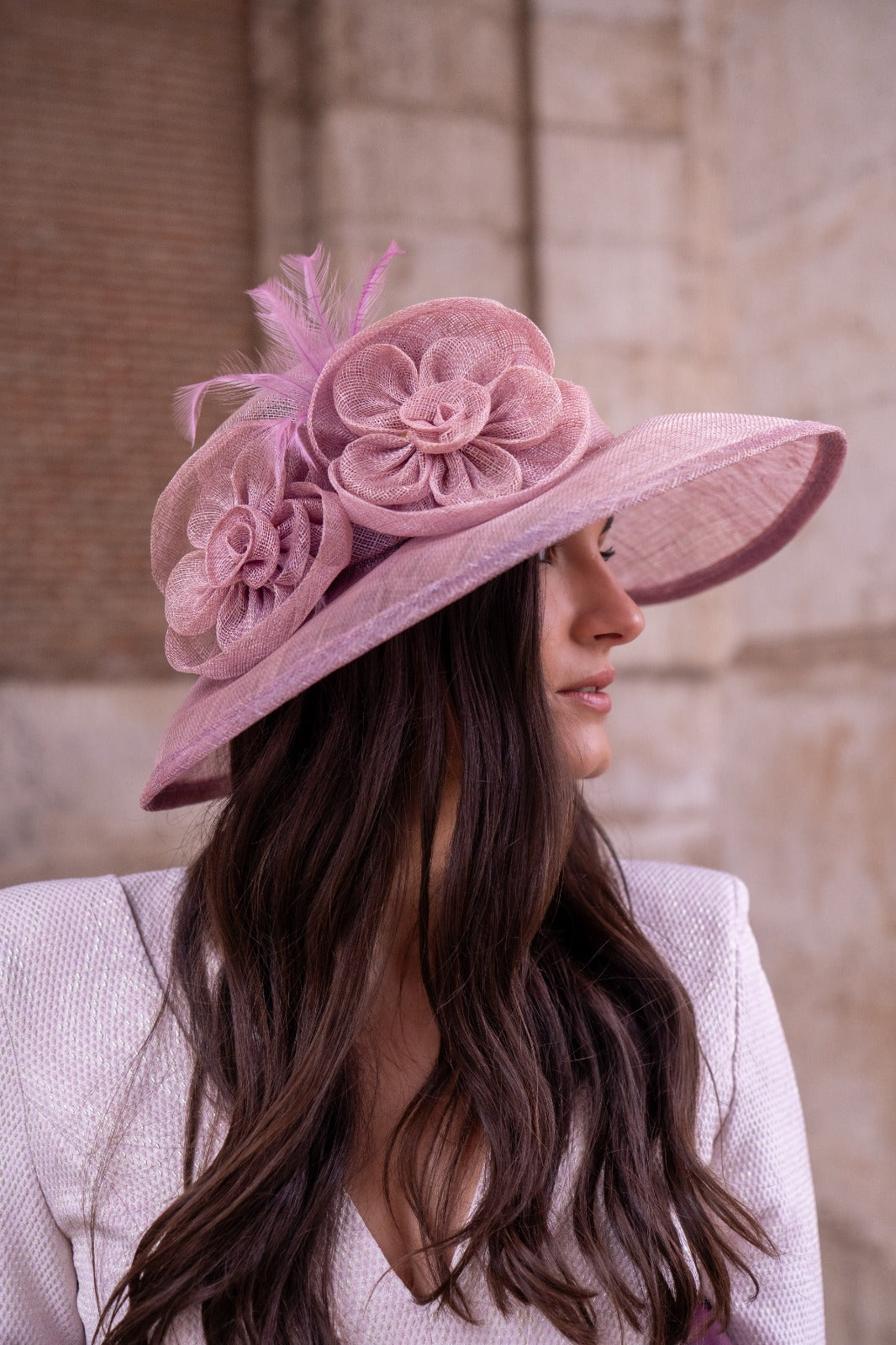 Hat in pink sinamay, with floral details on one side.