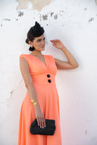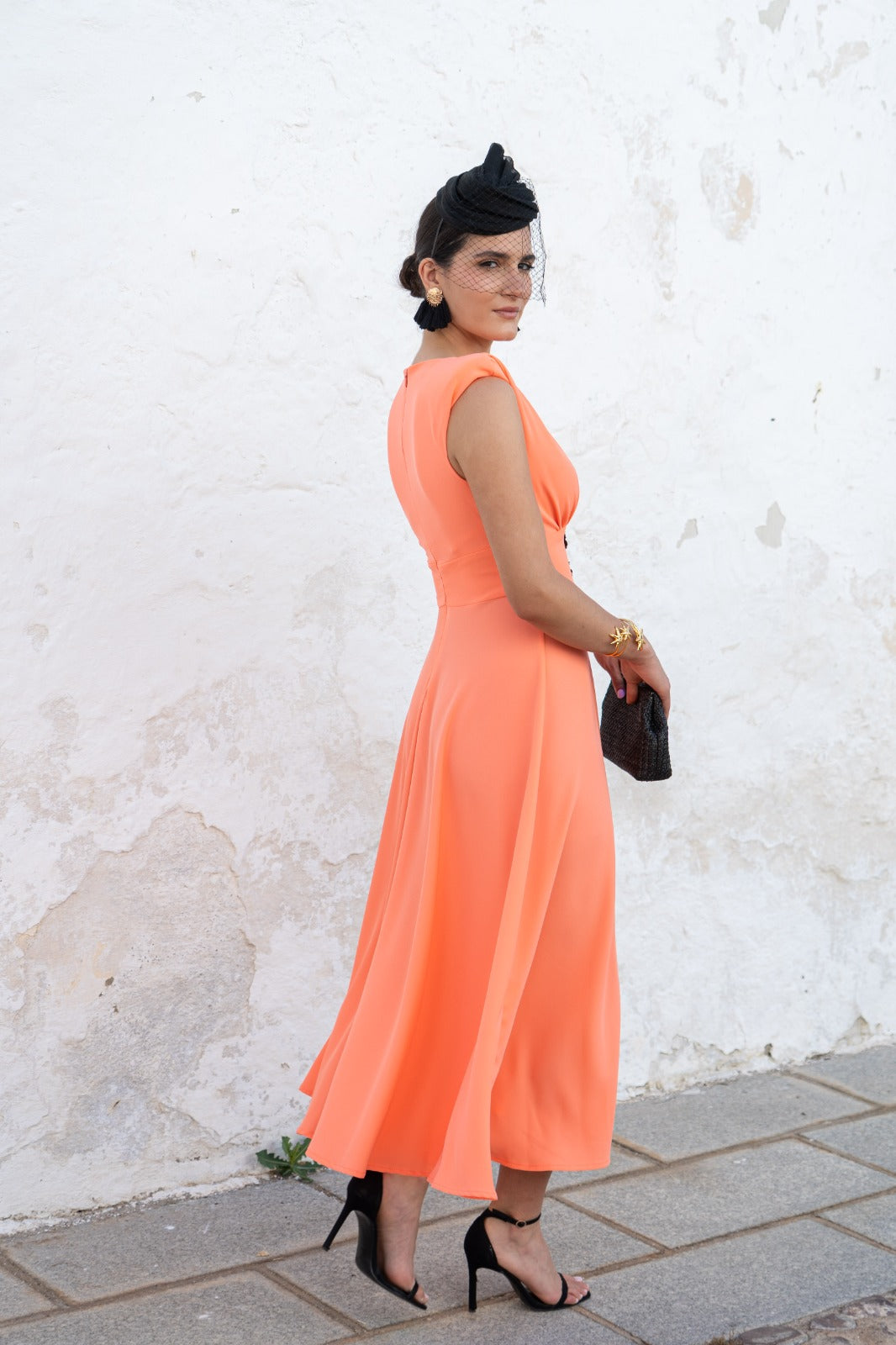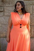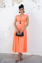 Midi dress with a V-neck, sleeveless, high-shoulder padding, a waist cut with button detailing, and flared bottom. In orange.