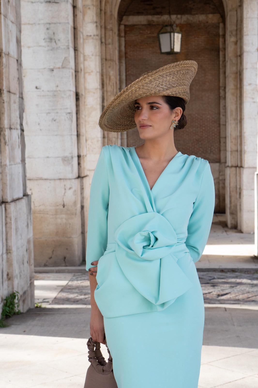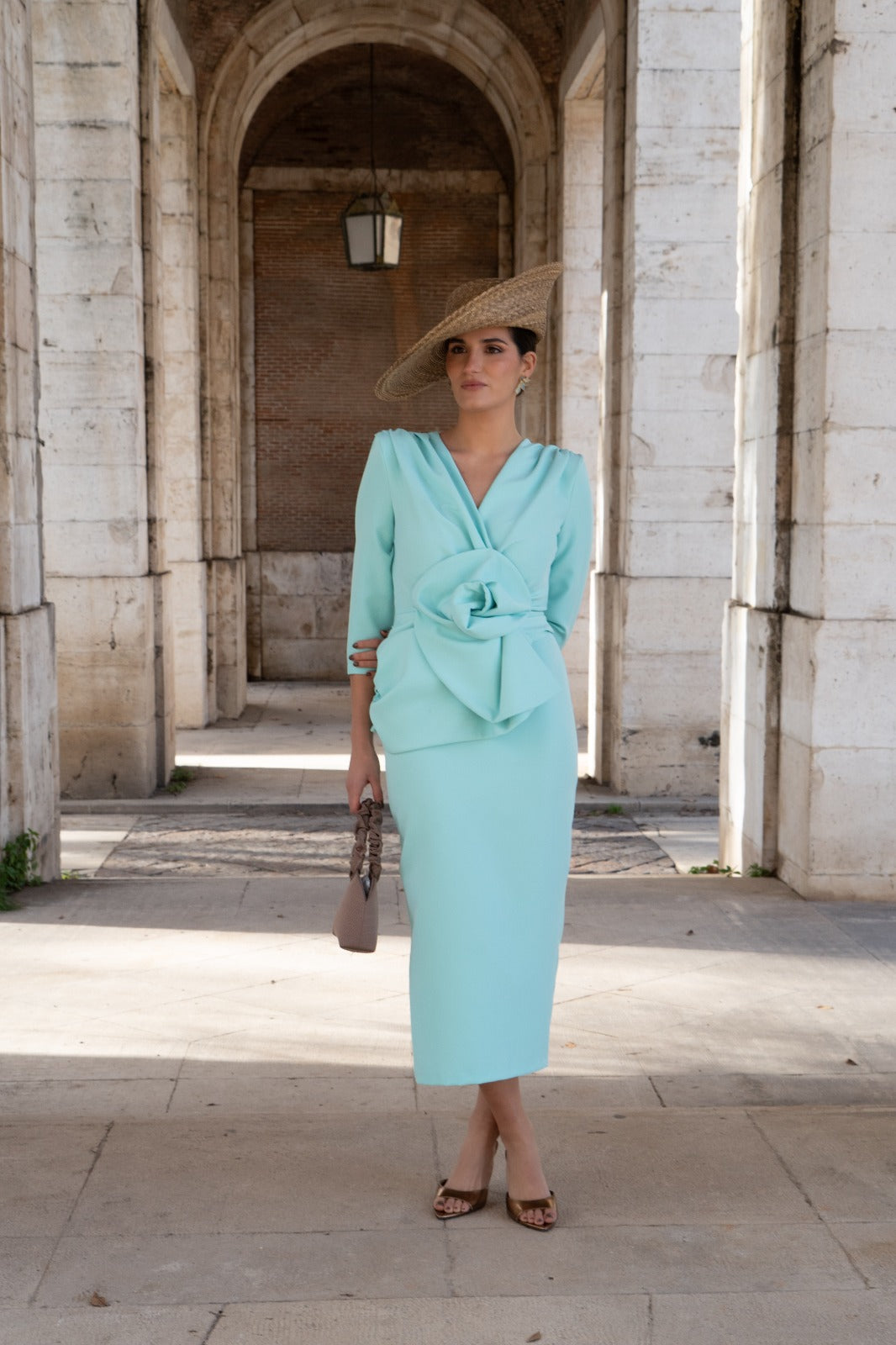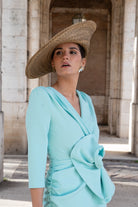 Green dress with a crossover neckline, three-quarter sleeves, peplum, and a flower detail at the waist, with a back slit.
