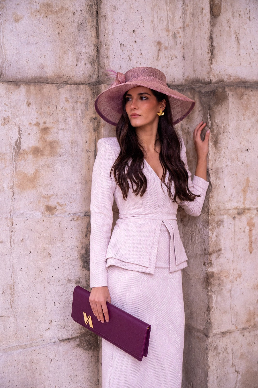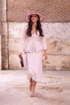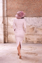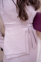 Midi dress, V-neck, three-quarter sleeves, peplum at the waist, sturdy fabric with gold lurex. In pink.