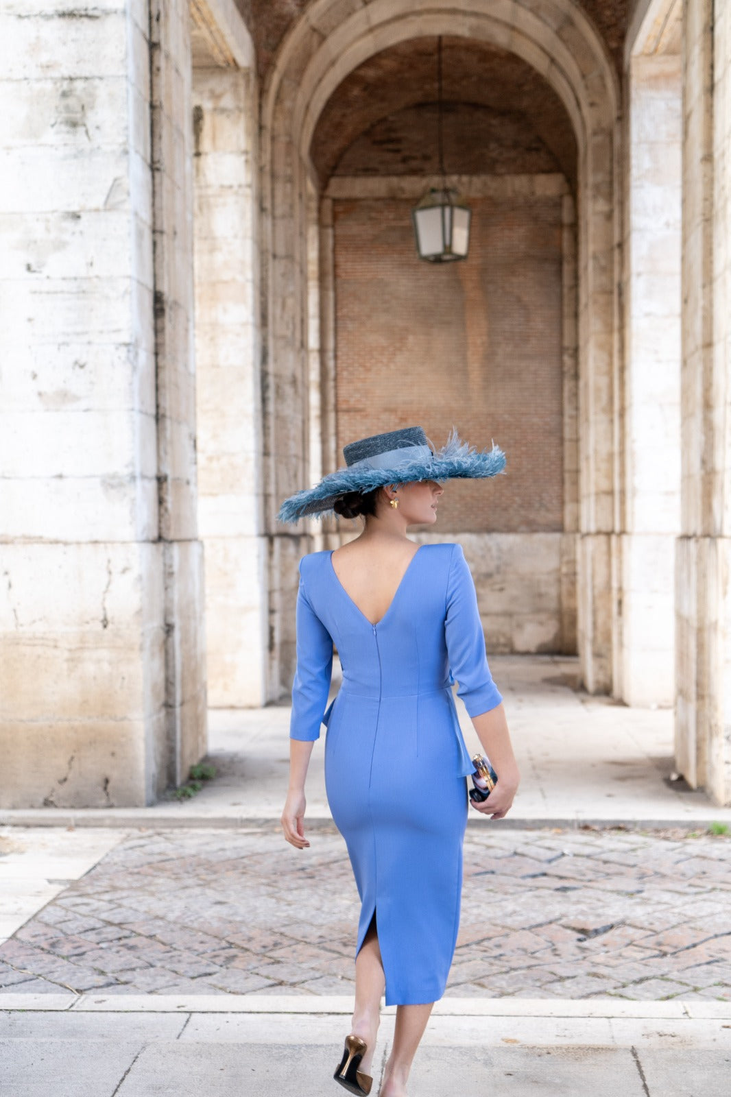 Midi dress, round front neckline and V-neck back, three-quarter sleeves, peplum waist, back slit. In blue.