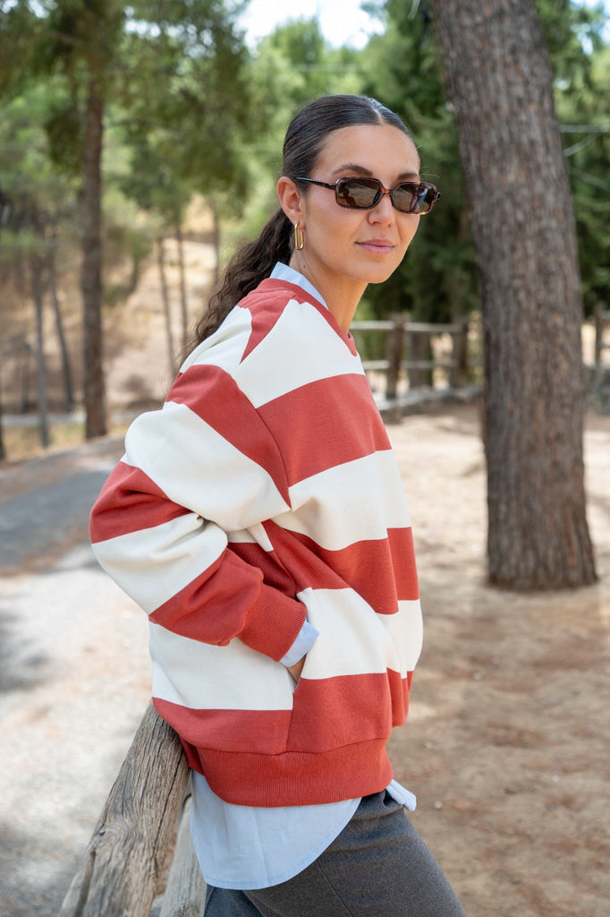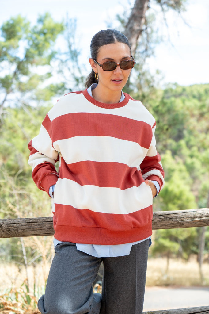 Sudadera escote redondo, bolsillos laterales, a rayas beige y teja.