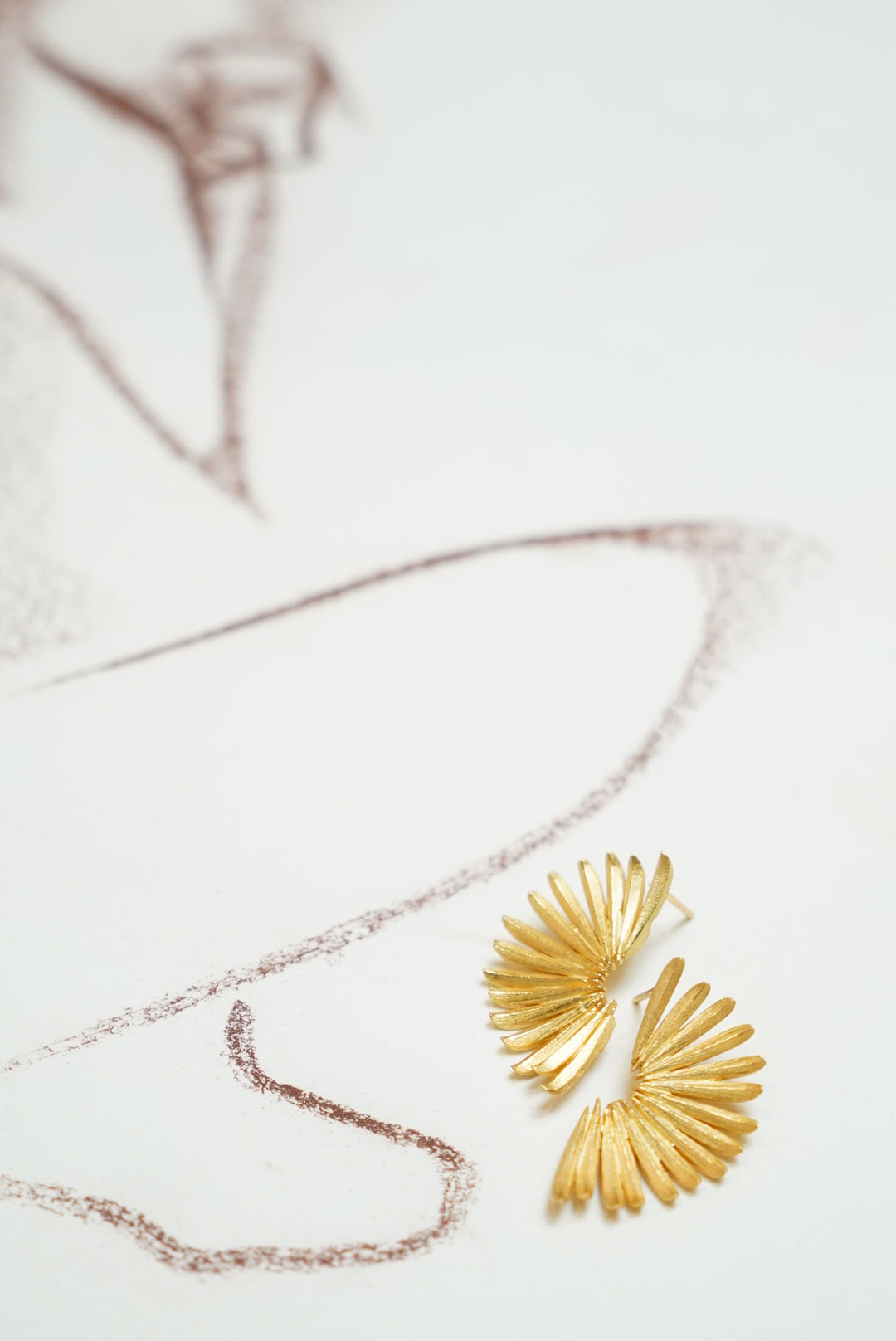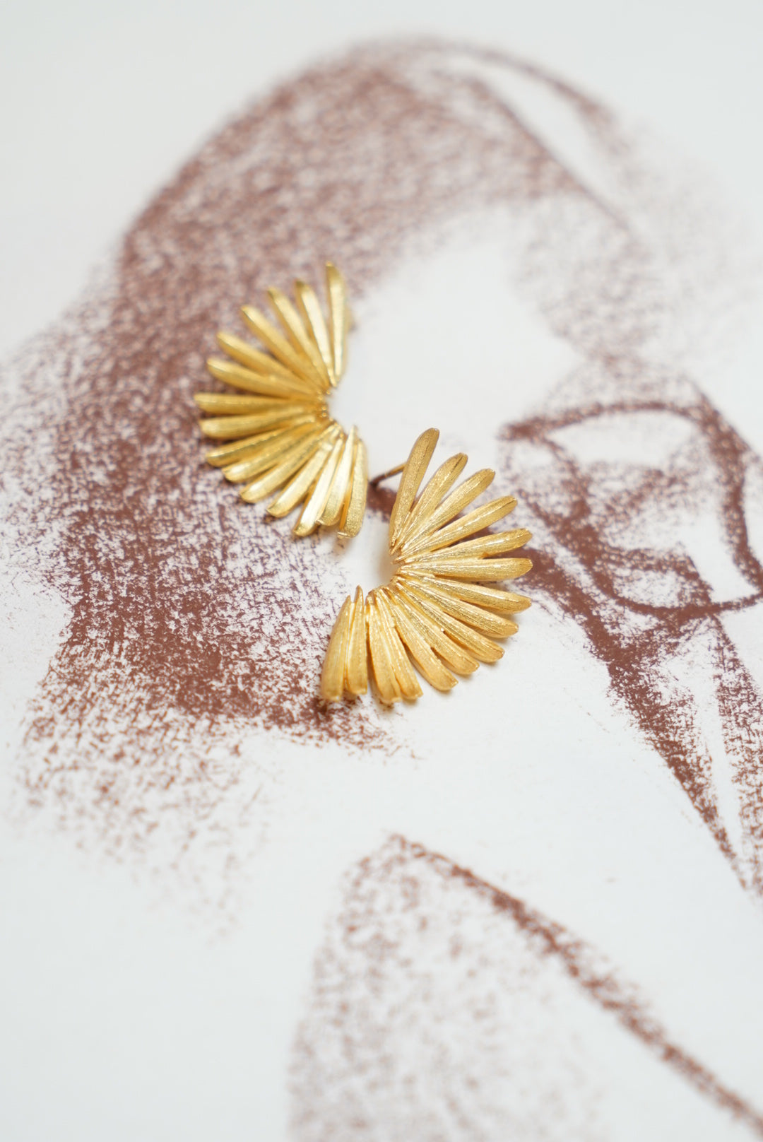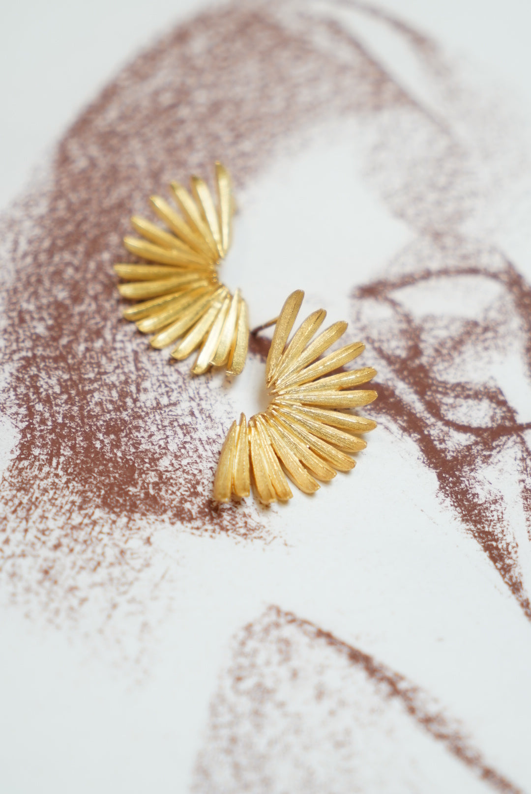 Geometric gold earrings; many lines overlapping in a regular manner, of similar length. Earrings made by hand.