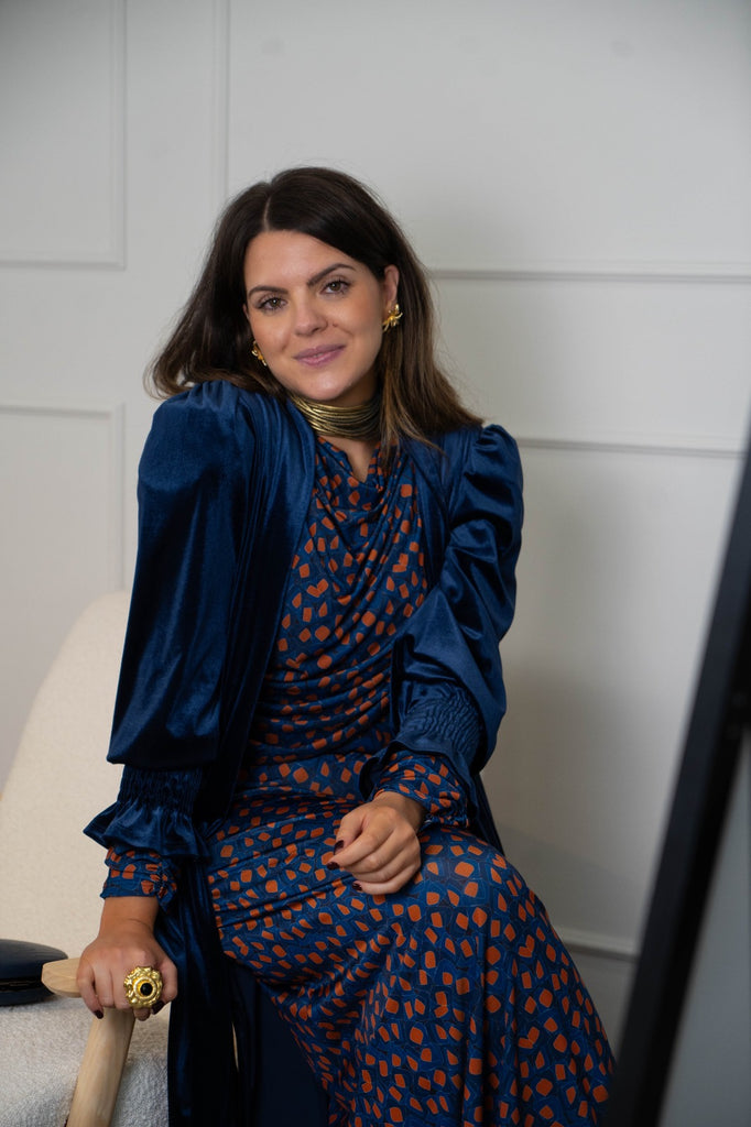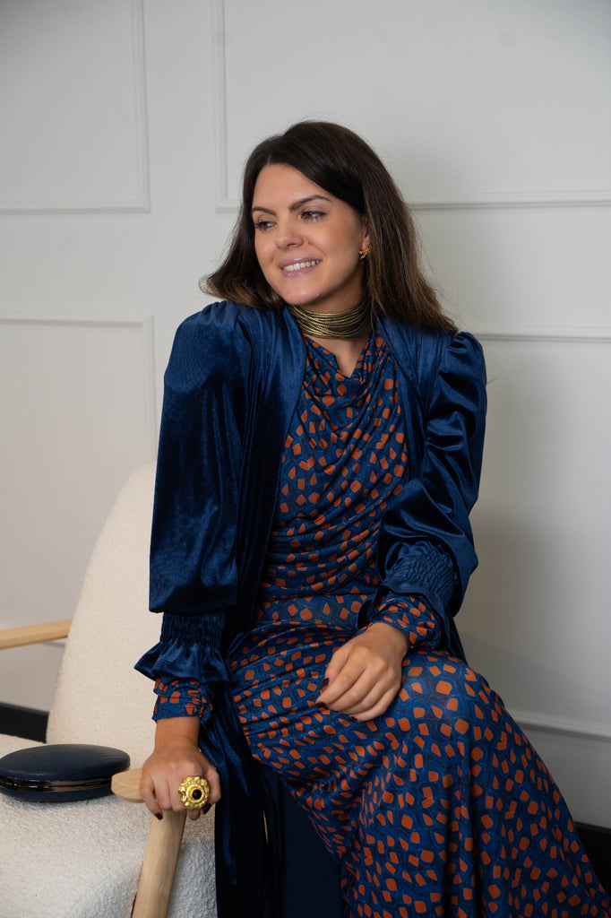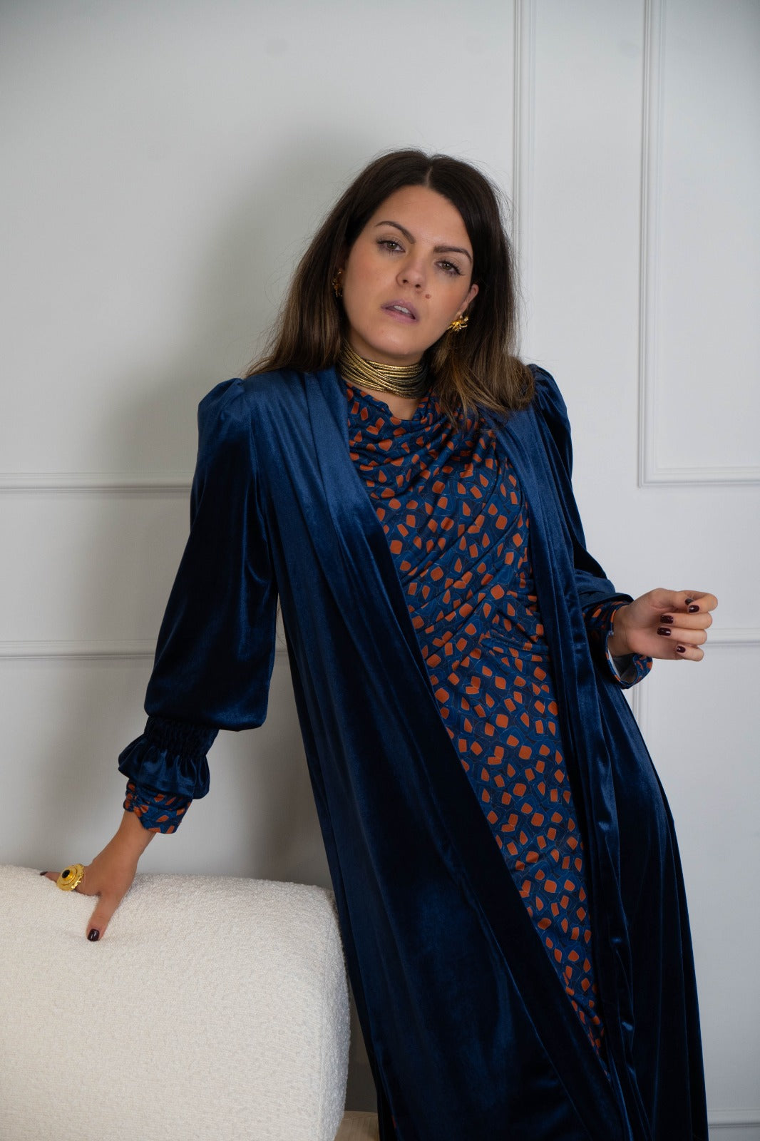 Abrigo en terciopelo, manga fruncida con hombrera, puño engomado. En color azul.