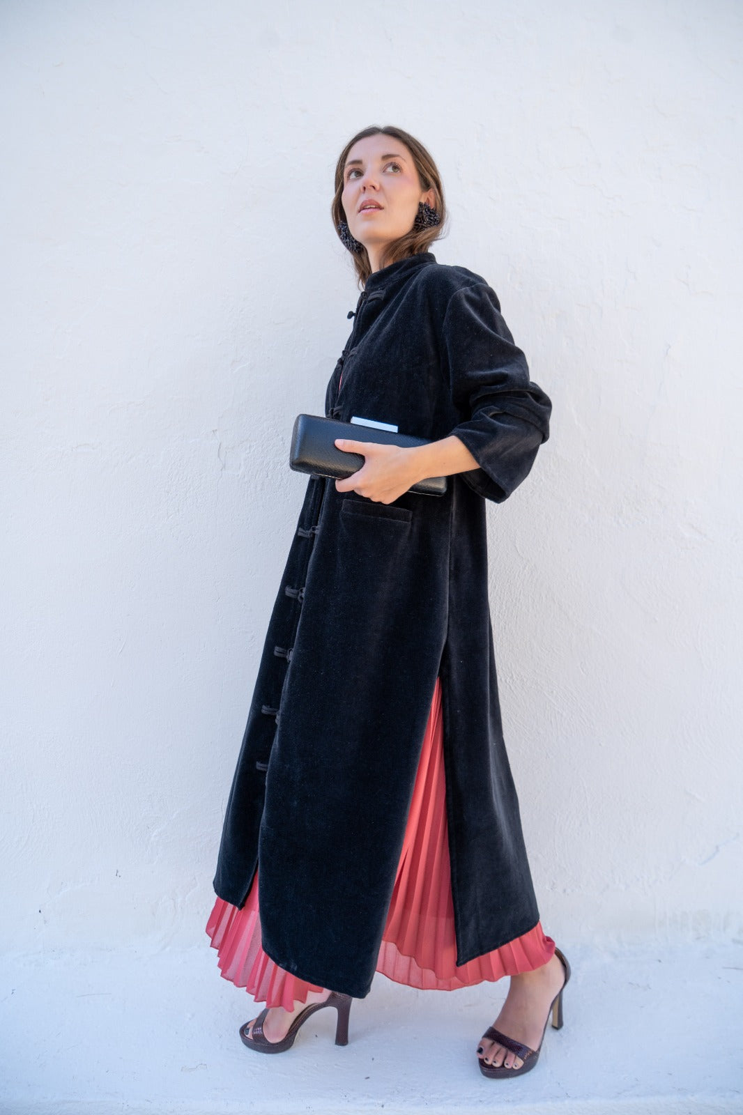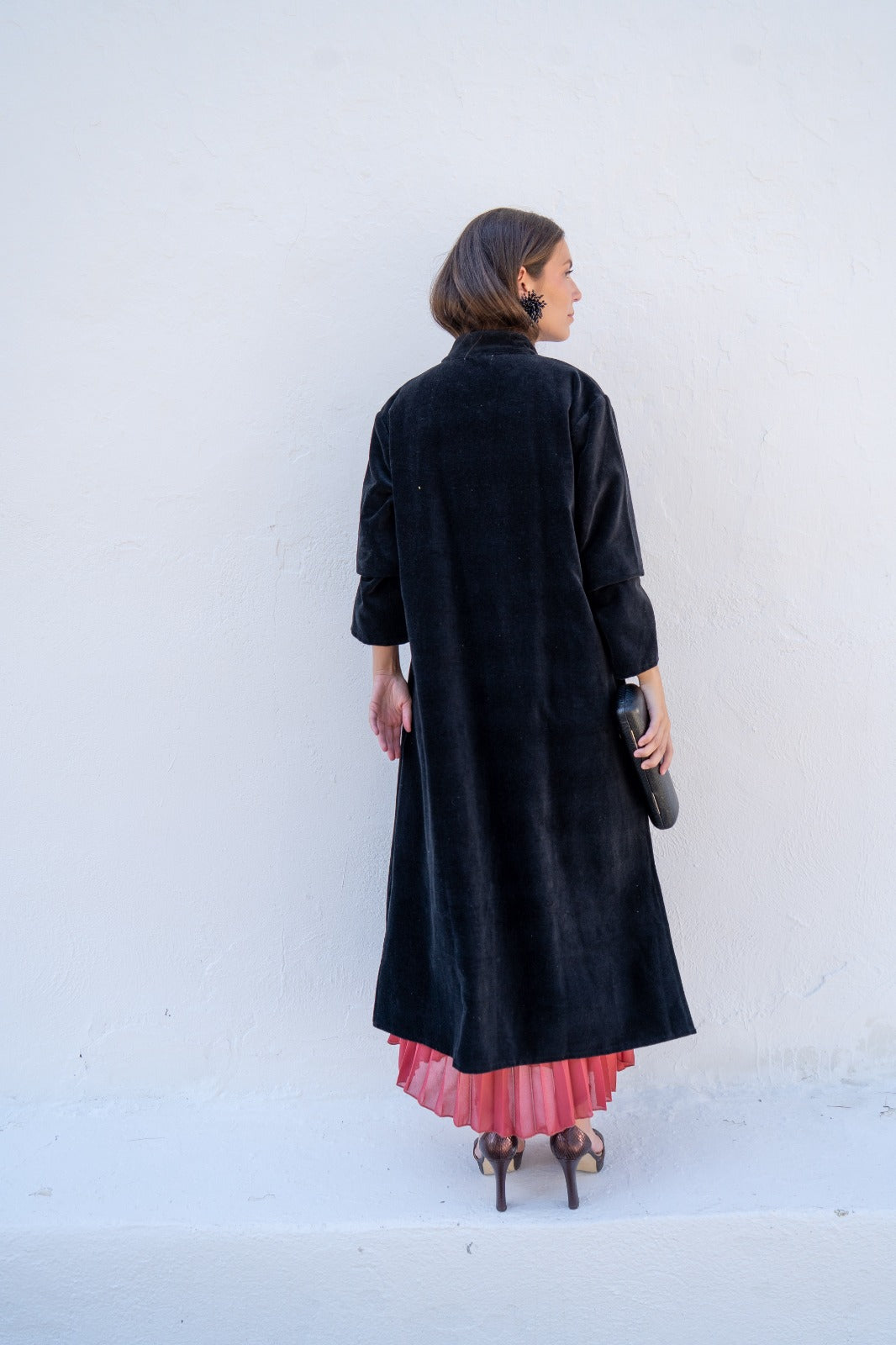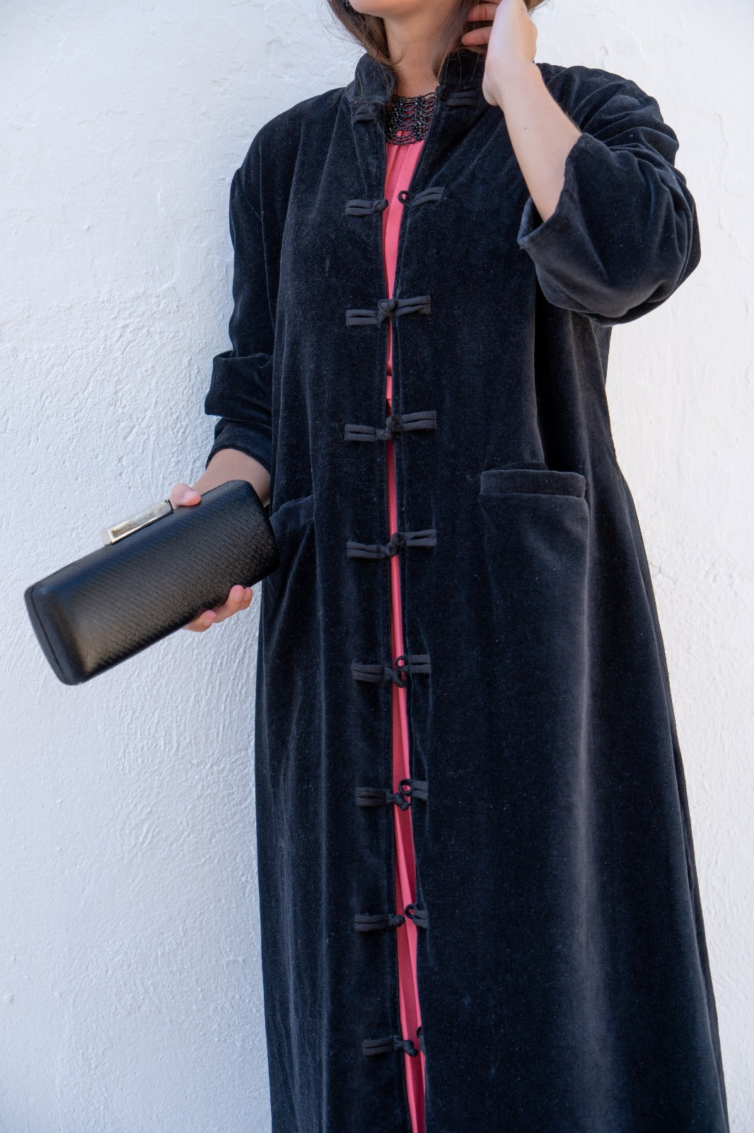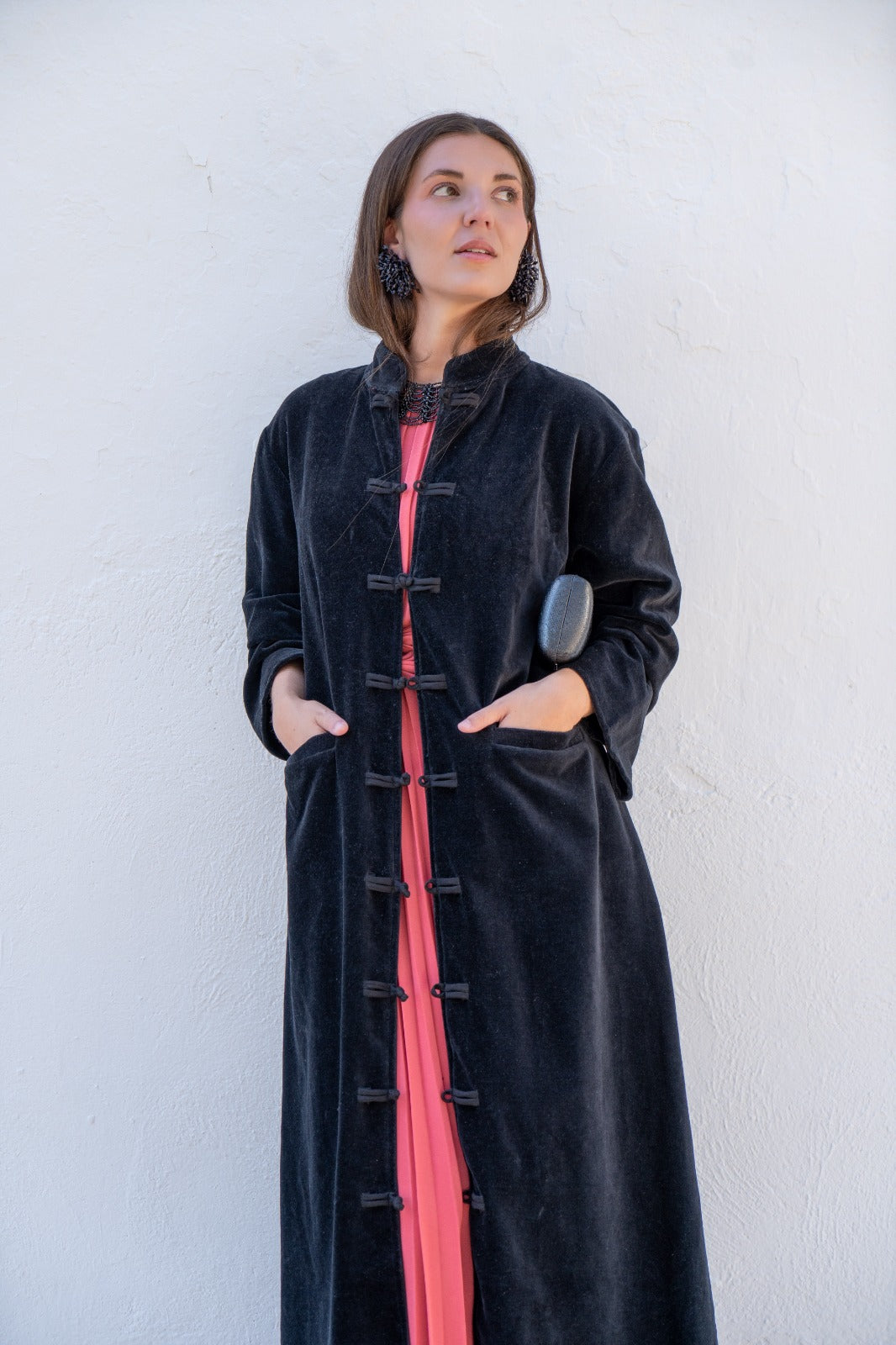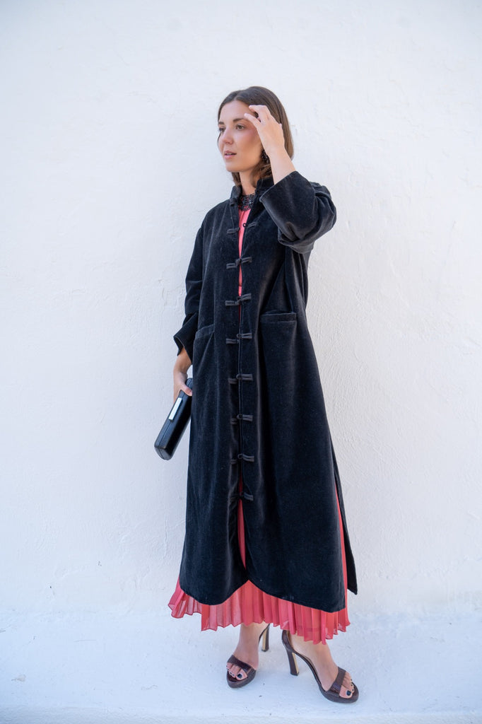 Kaftan recto, aberturas a los lados, manga larga, bolsillos delanteros. En terciopelo color negro.