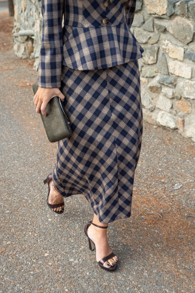 Conjunto compuesto por falsa chaqueta, escote cuadrado, manga larga, detalle botones delanteros, peplum y falta alta, corte evase. En cuadros marrón y marino.