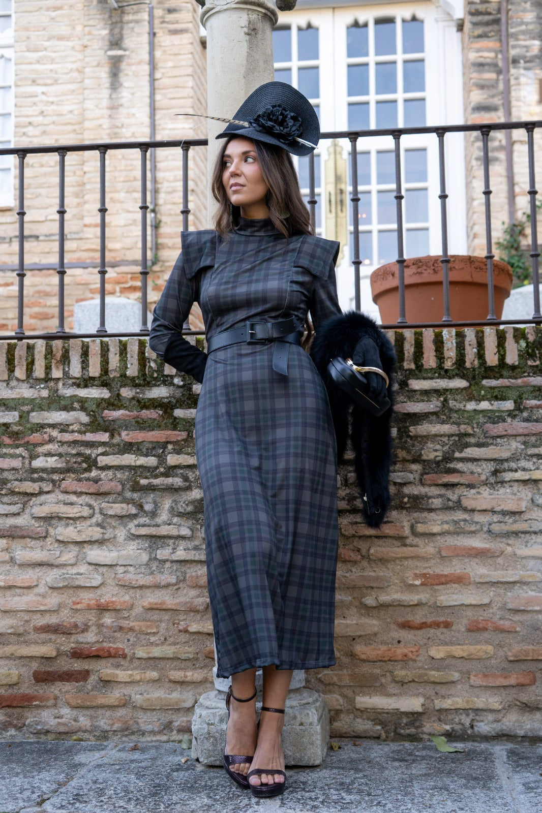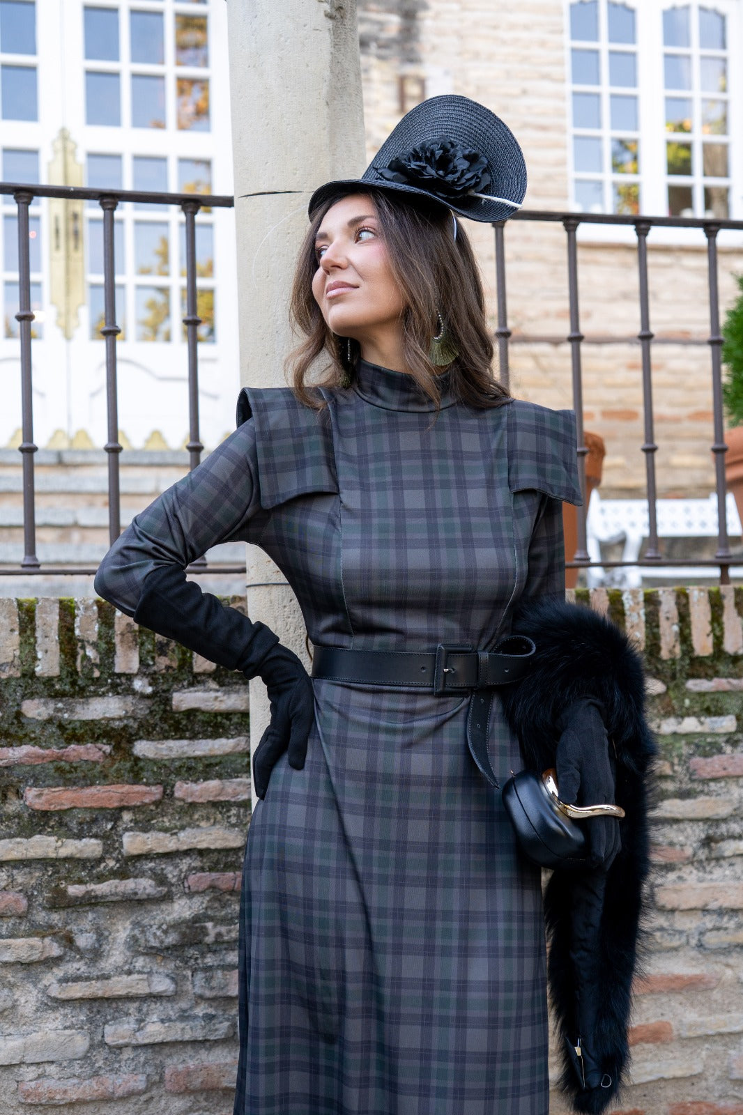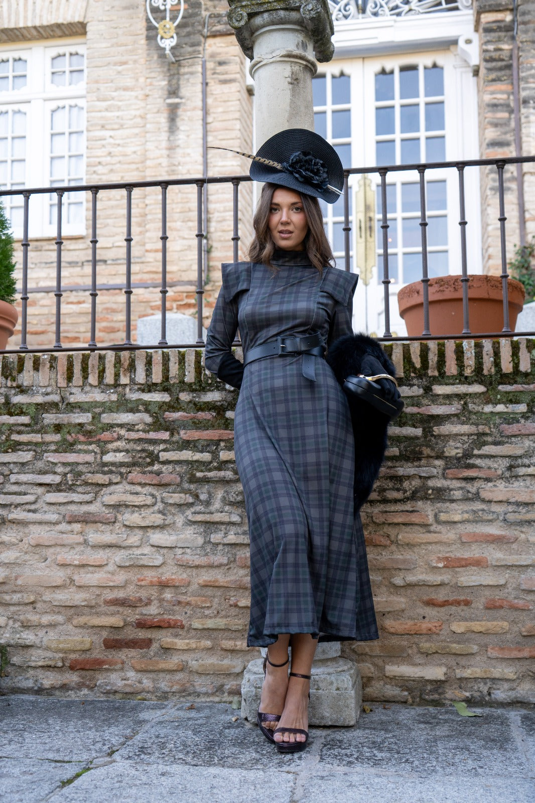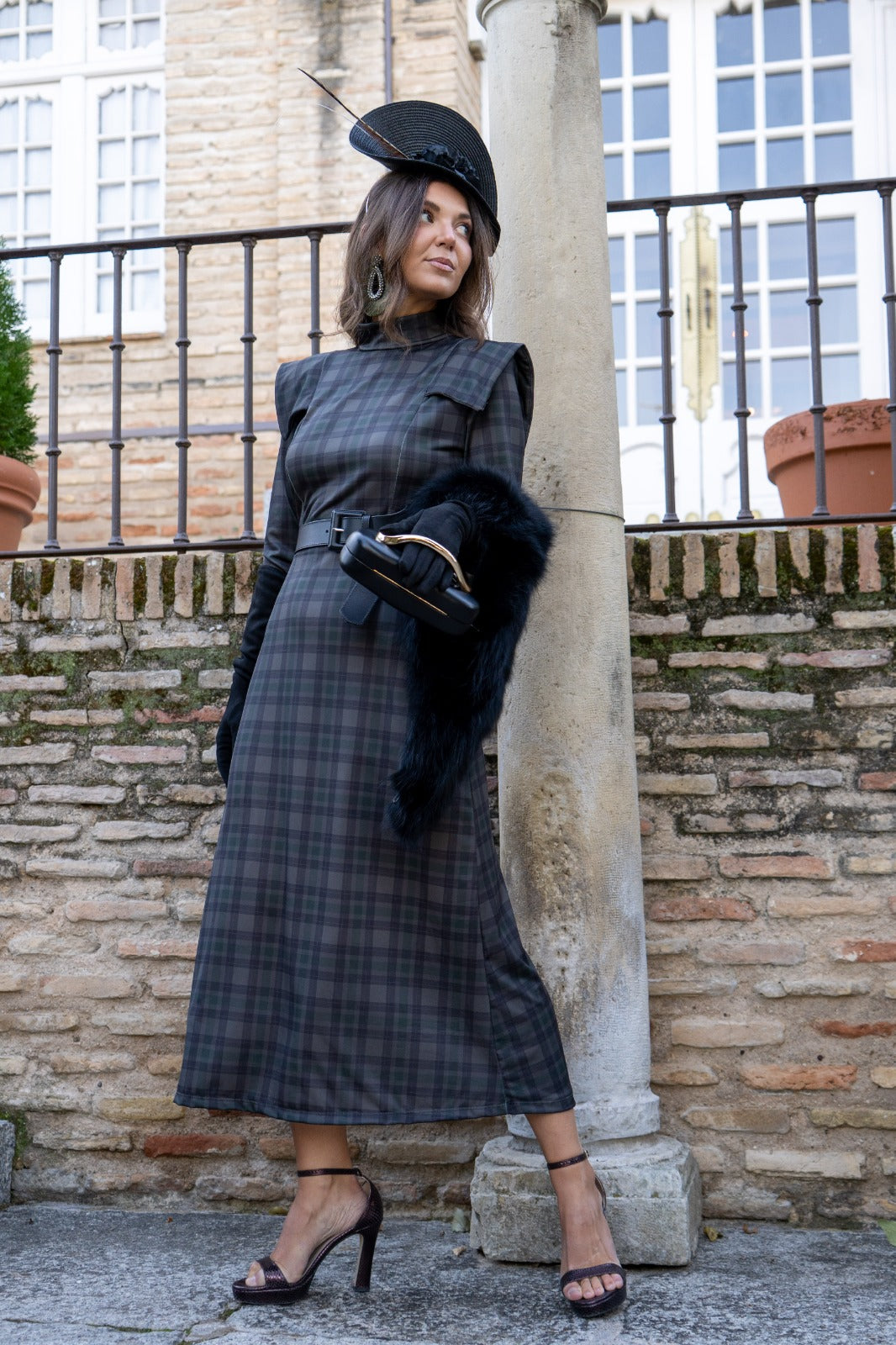 Vestido midi, cuello perkins, alerones en hombro, corte en cintura, totalmente elástico, en cuadros verde y negro.