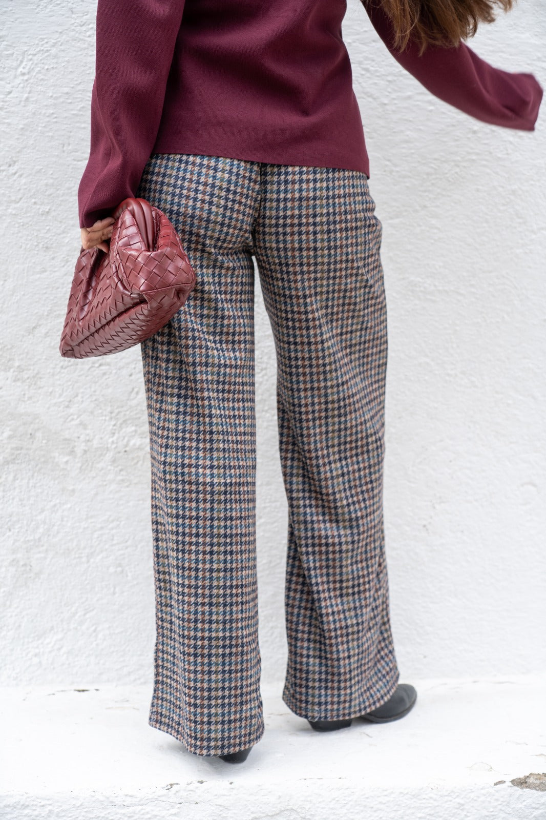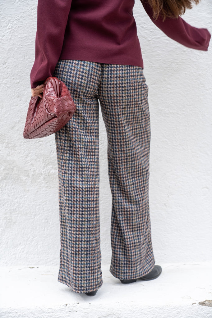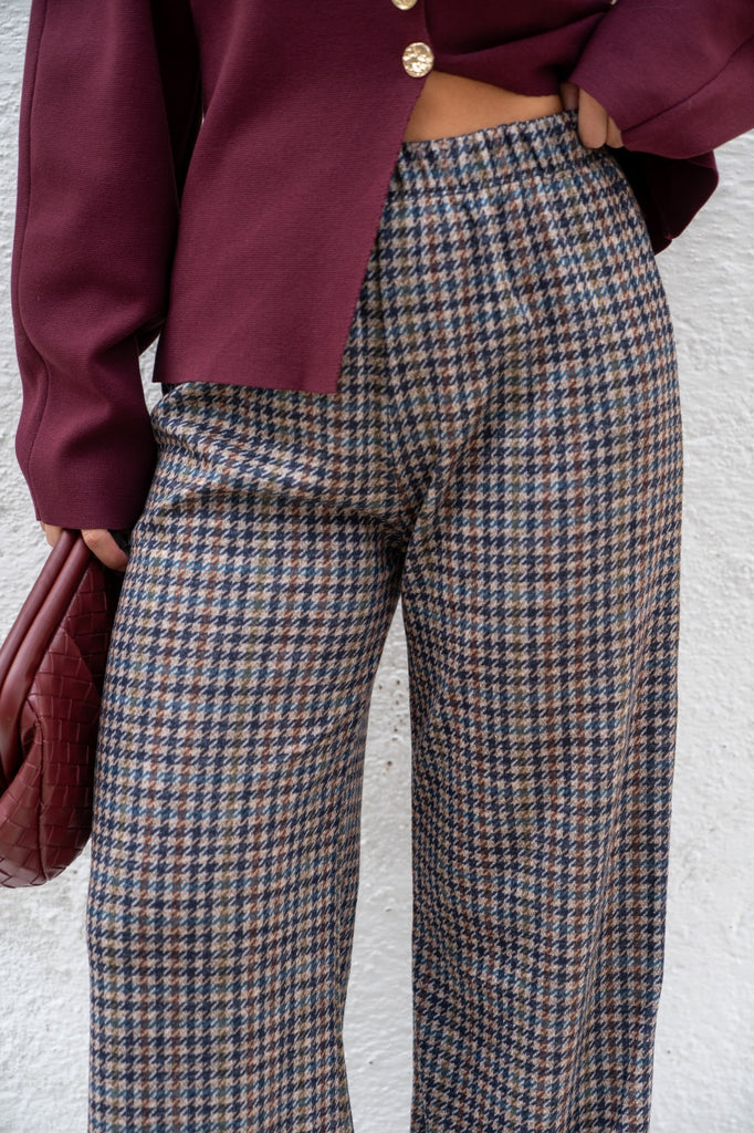 Pantalón goma en cintura, tejido grueso, en cuadros multicolor.