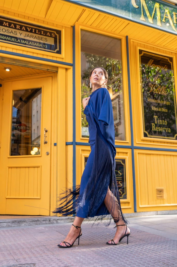 Vestido midi, escote redondo subido con tira transparente, manga francesa, abertura trasera, kaftan con flecos y fajín. En color azul.