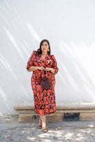 Midi dress with a crossover neckline, three-quarter sleeves with elastic cuffs, and a side slit in the front. Brown and tile print.