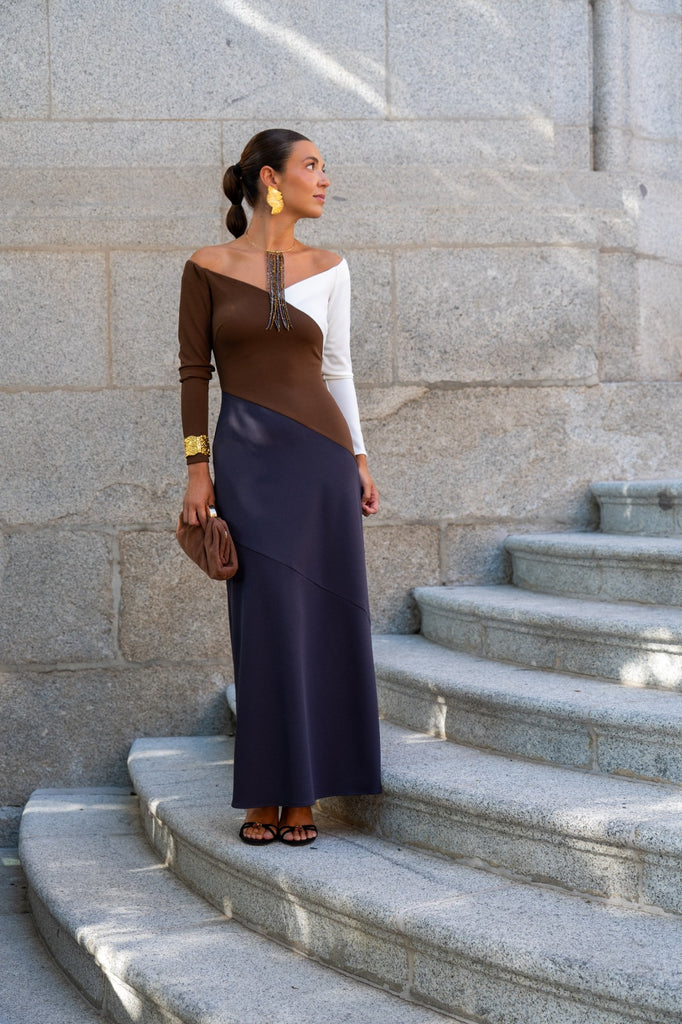 Vestido modo, escote bardot, manga larga, con vuelo. En punto tricolor marrón, blanco y gris.