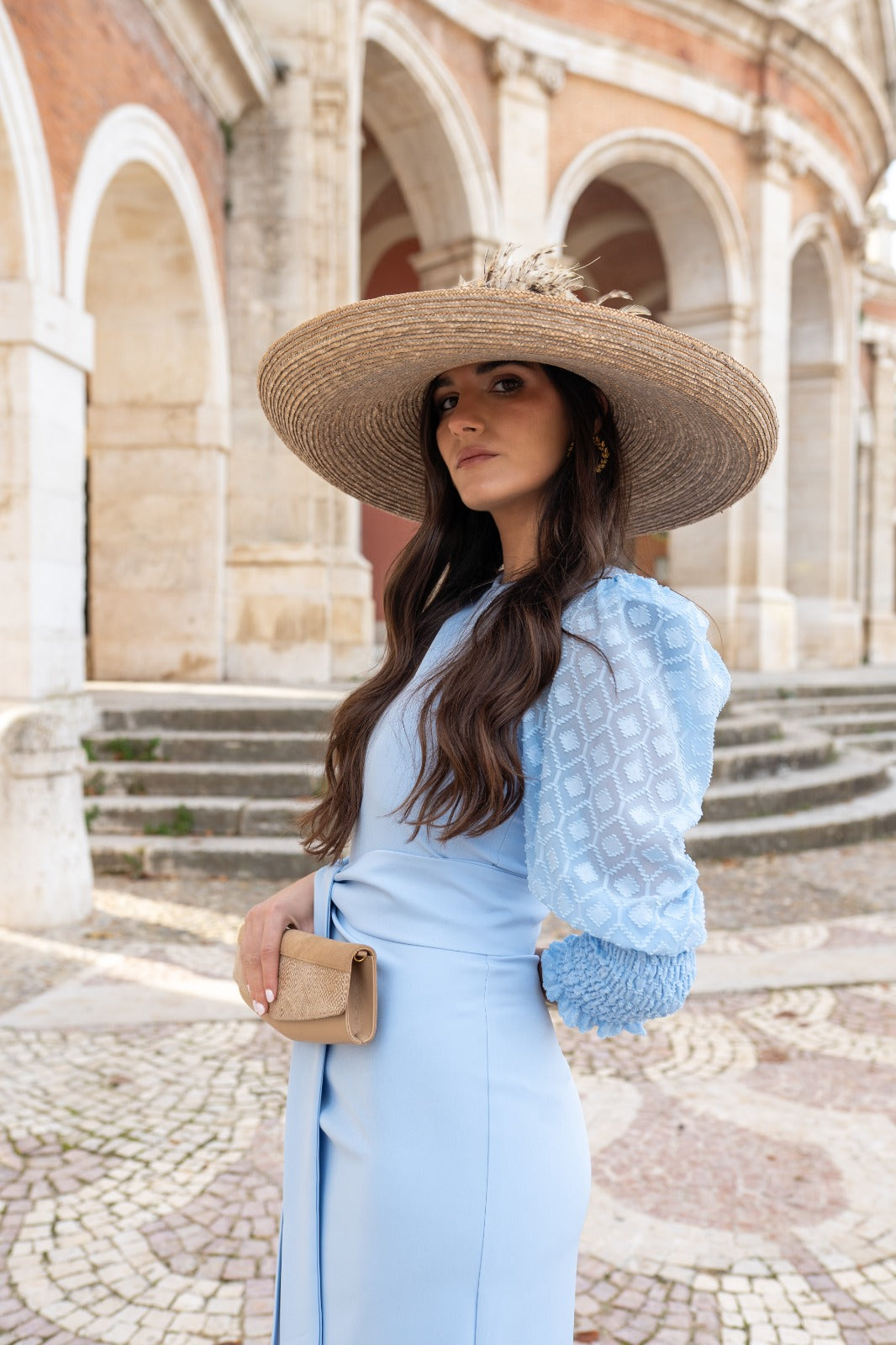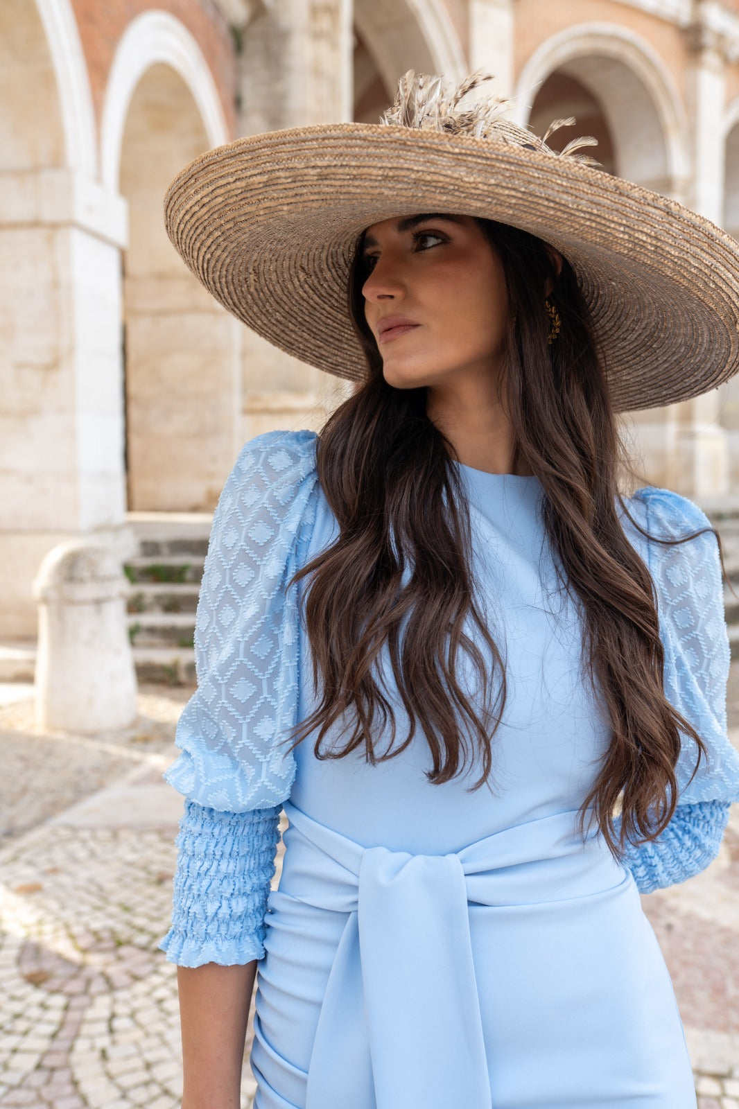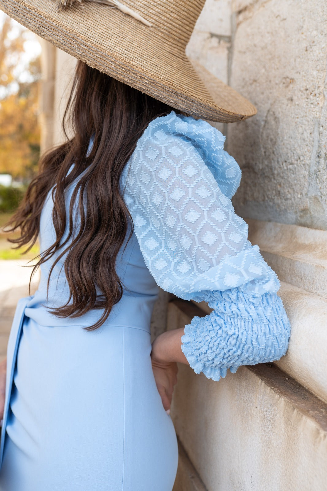 Midi dress, round neckline, plumeti sleeves with gathered cuffs, back slit, belt included. In blue.