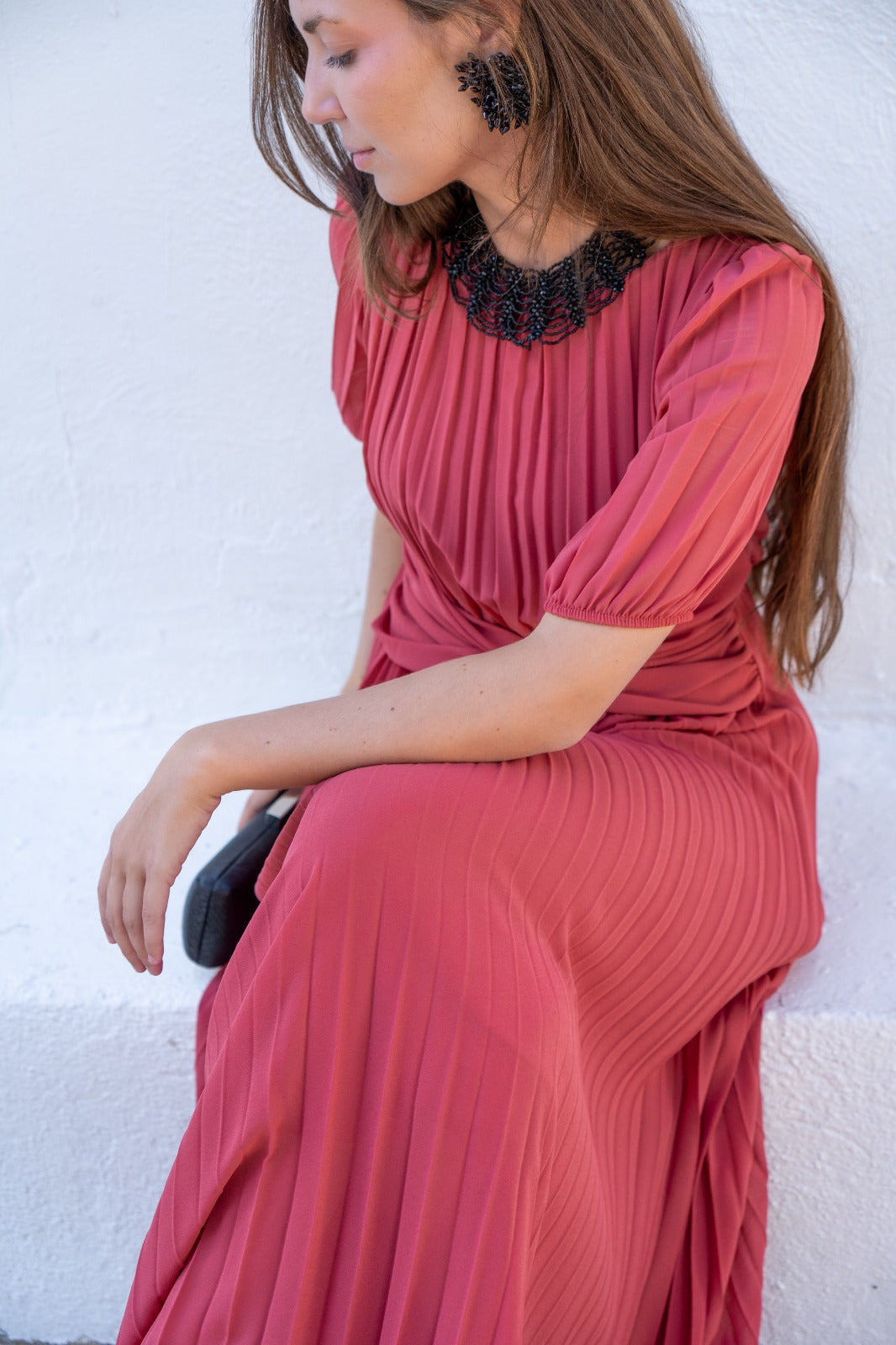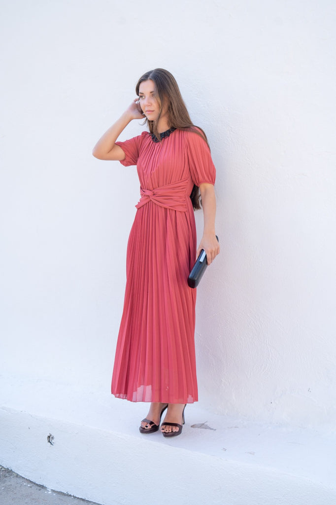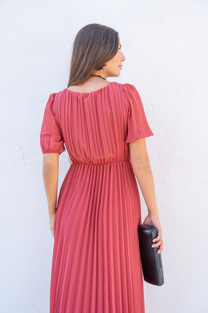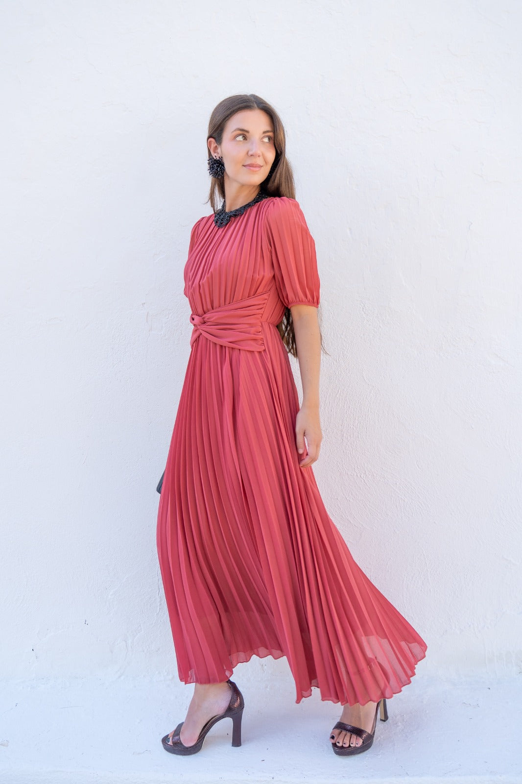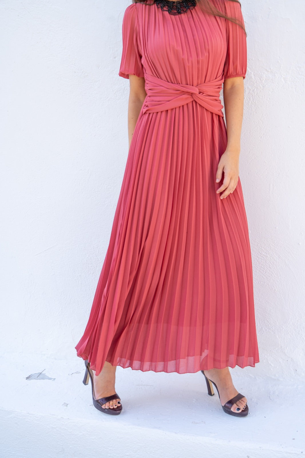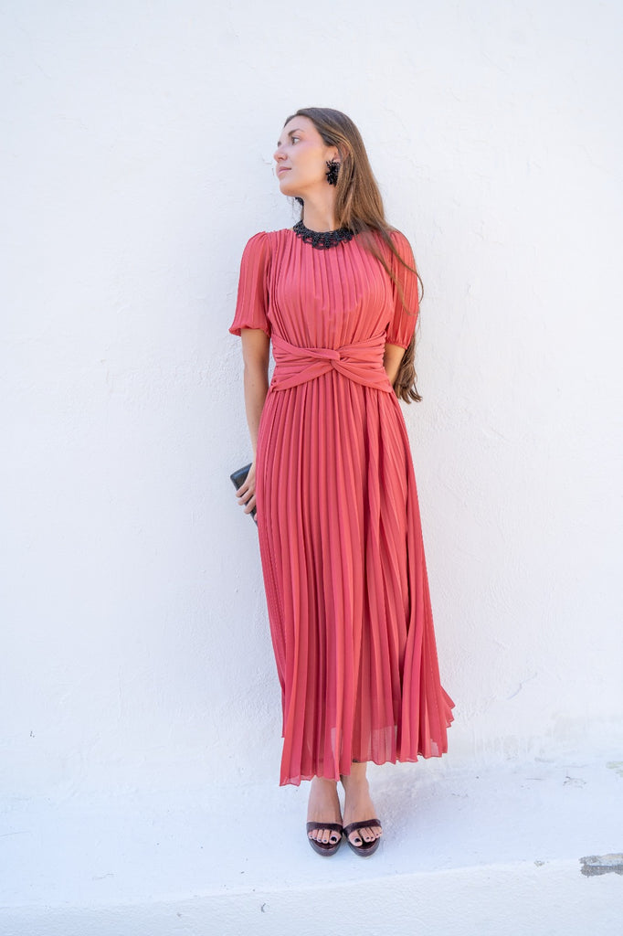 Vestido midi, escote redondo, manga corta con goma, corte en cintura, plisado. En color coral.