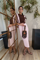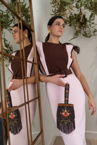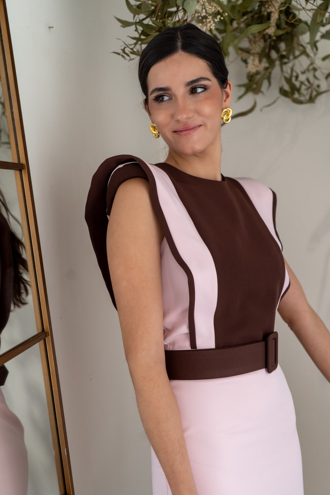 Vestido midi, escote redondo, sin mangas hombrera alta, corten cintura con cinturón. Bicolor rosa y marrón.