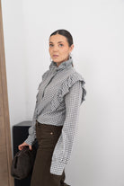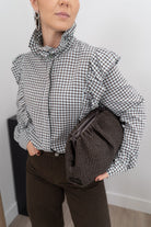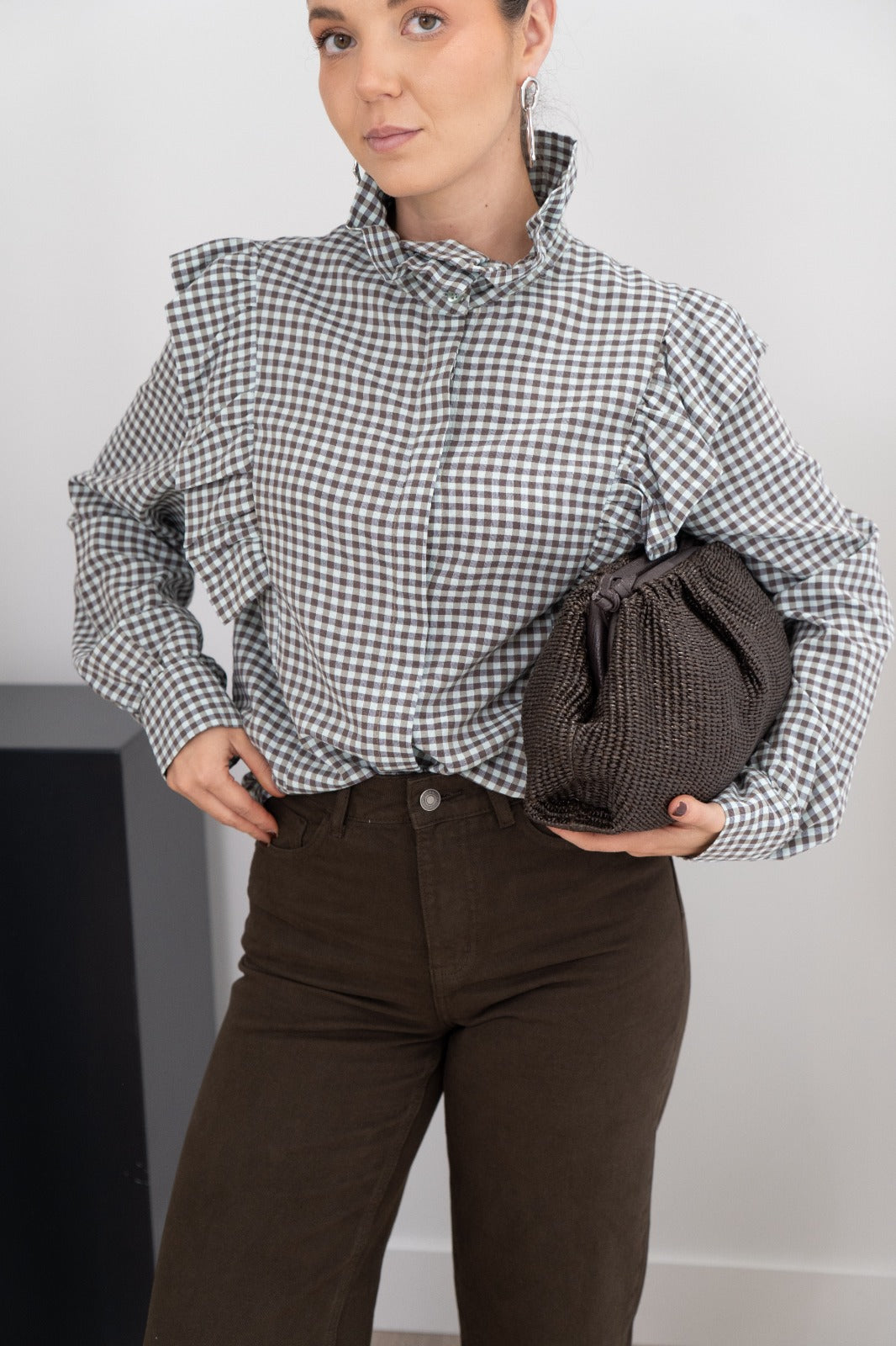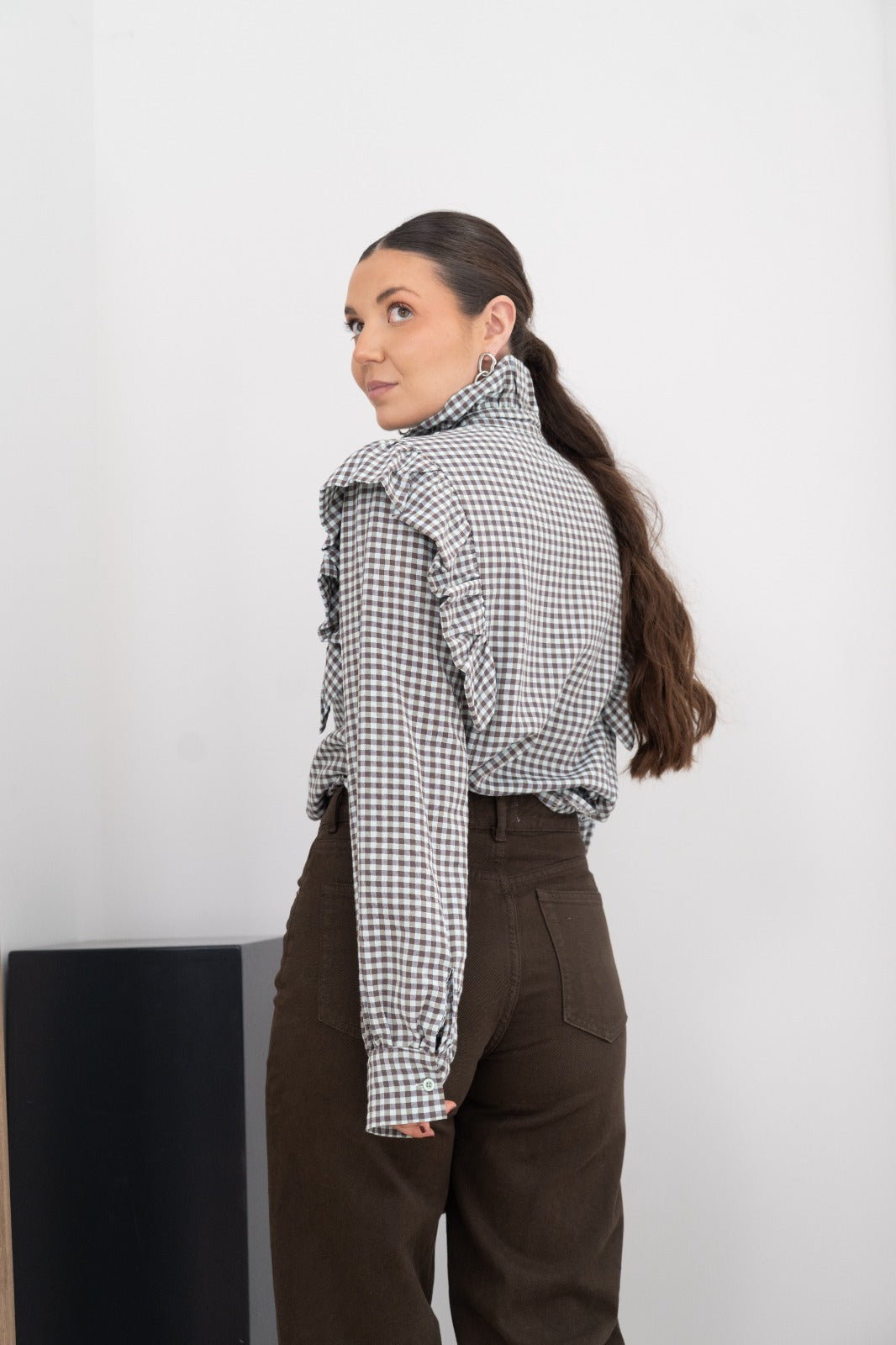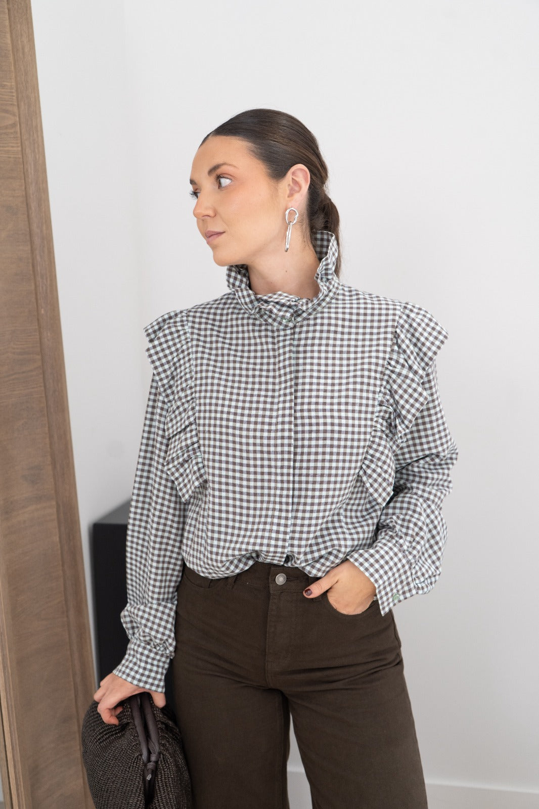 Blusa cuello subido abotonada, manga larga con puño, volante en hombros. En vichy marrón.