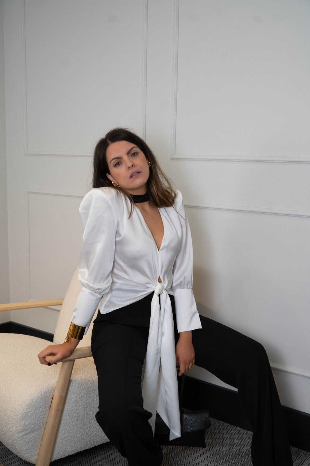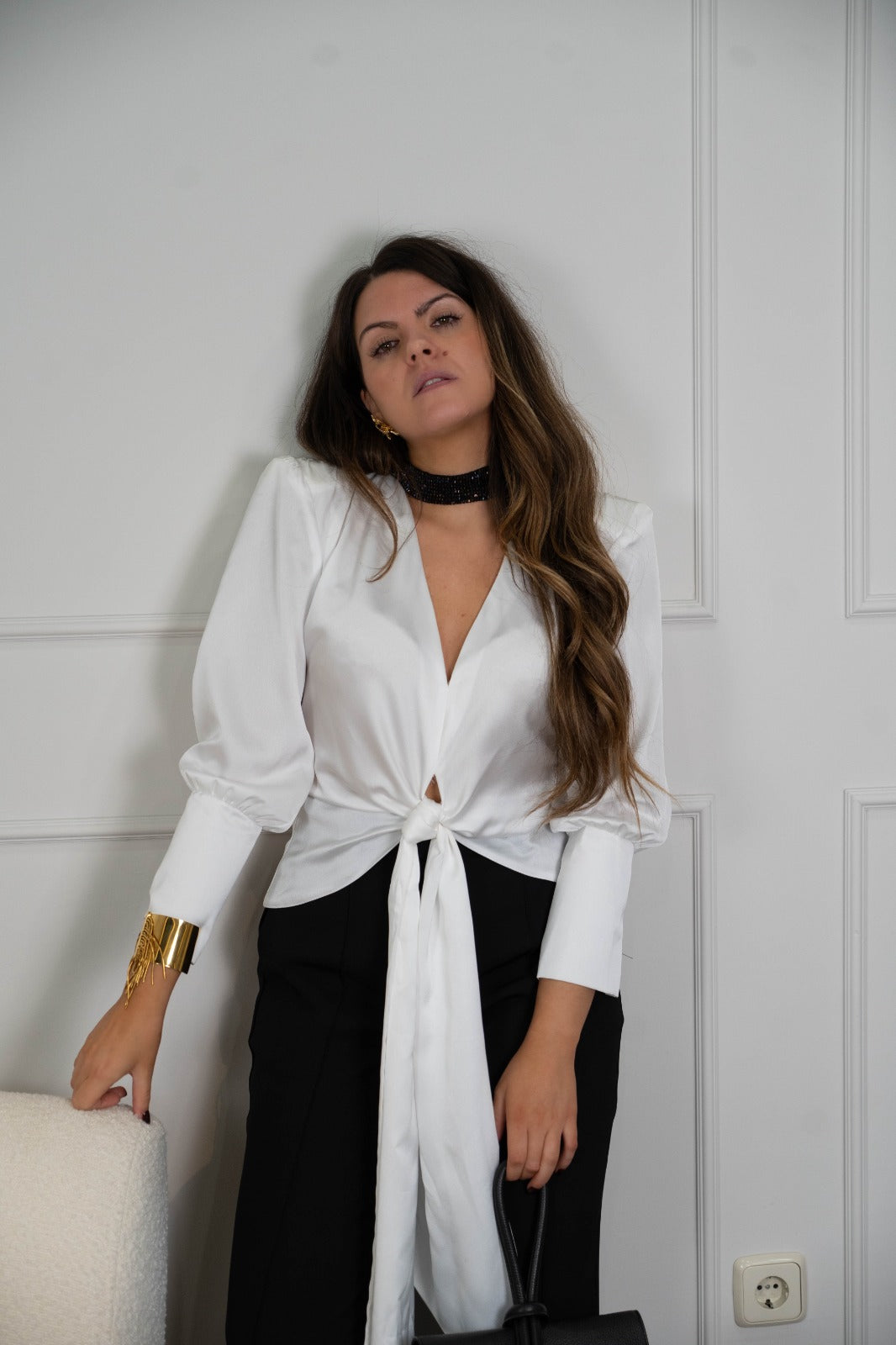 Blusa en saten, escote a pico, manga larga con puño abotonado, anudada delante. En color blanco.