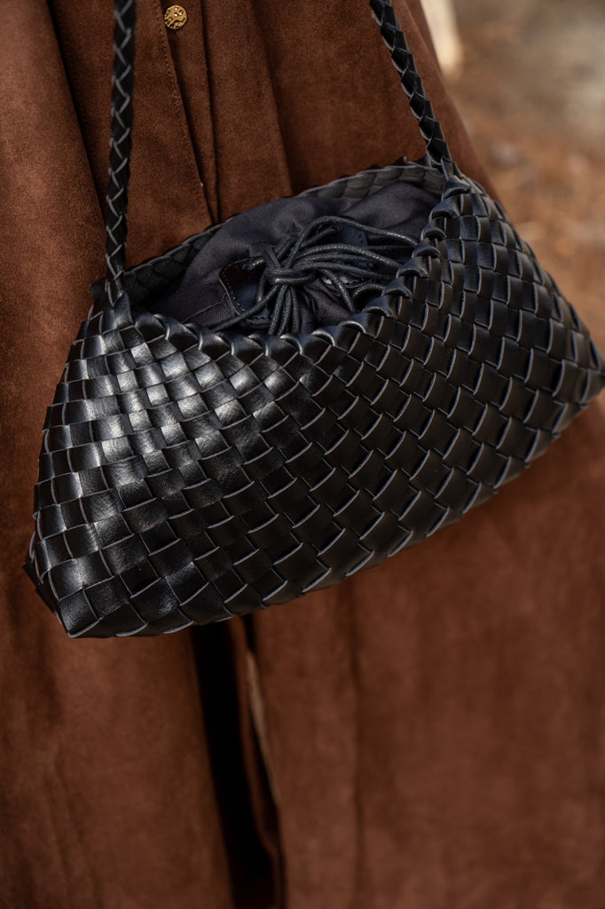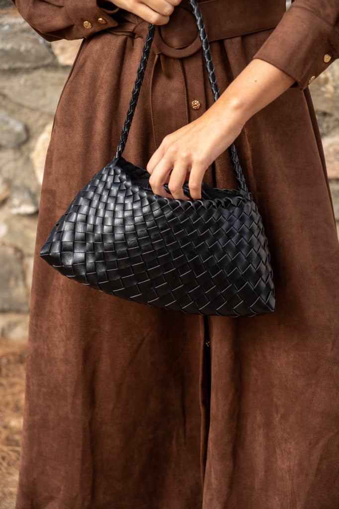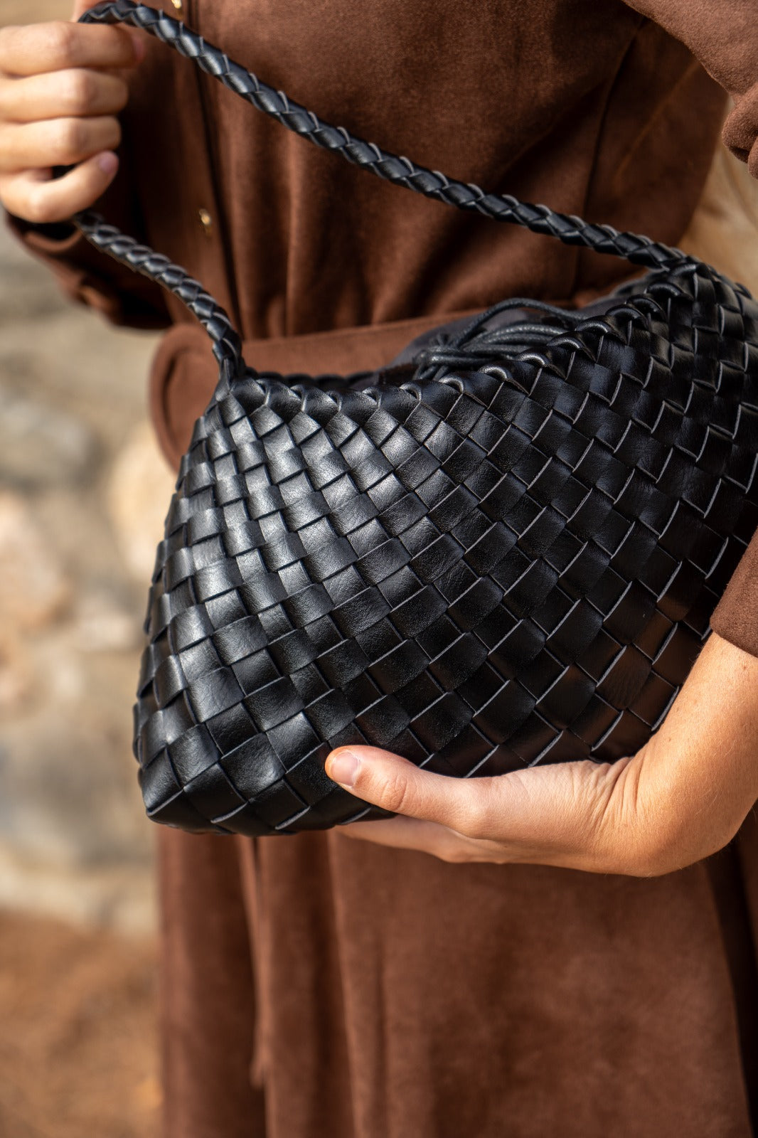 Bolso en poli piel, asa larga, detalle poli piel cruzada, cremallera, en color negro.