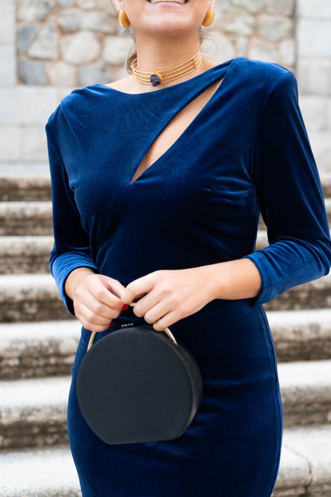 Bolso forrado en satén negro, asa rígida y cadena para colgar en color plata.