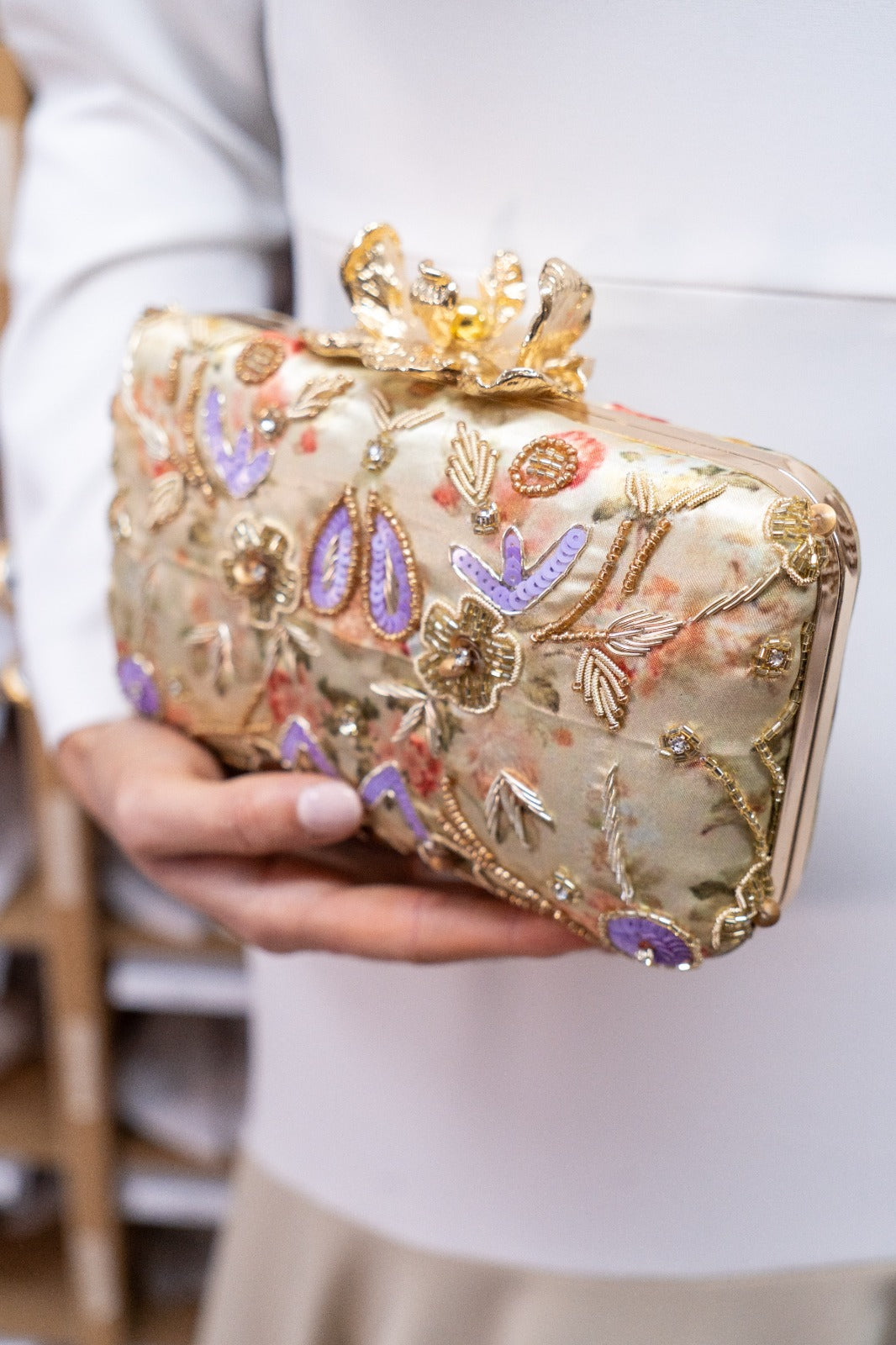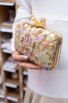 Bolso ovalado, con pomo dorado, cadena larga para colgar. Con estampados y pedrería palmeras en varios colores.
