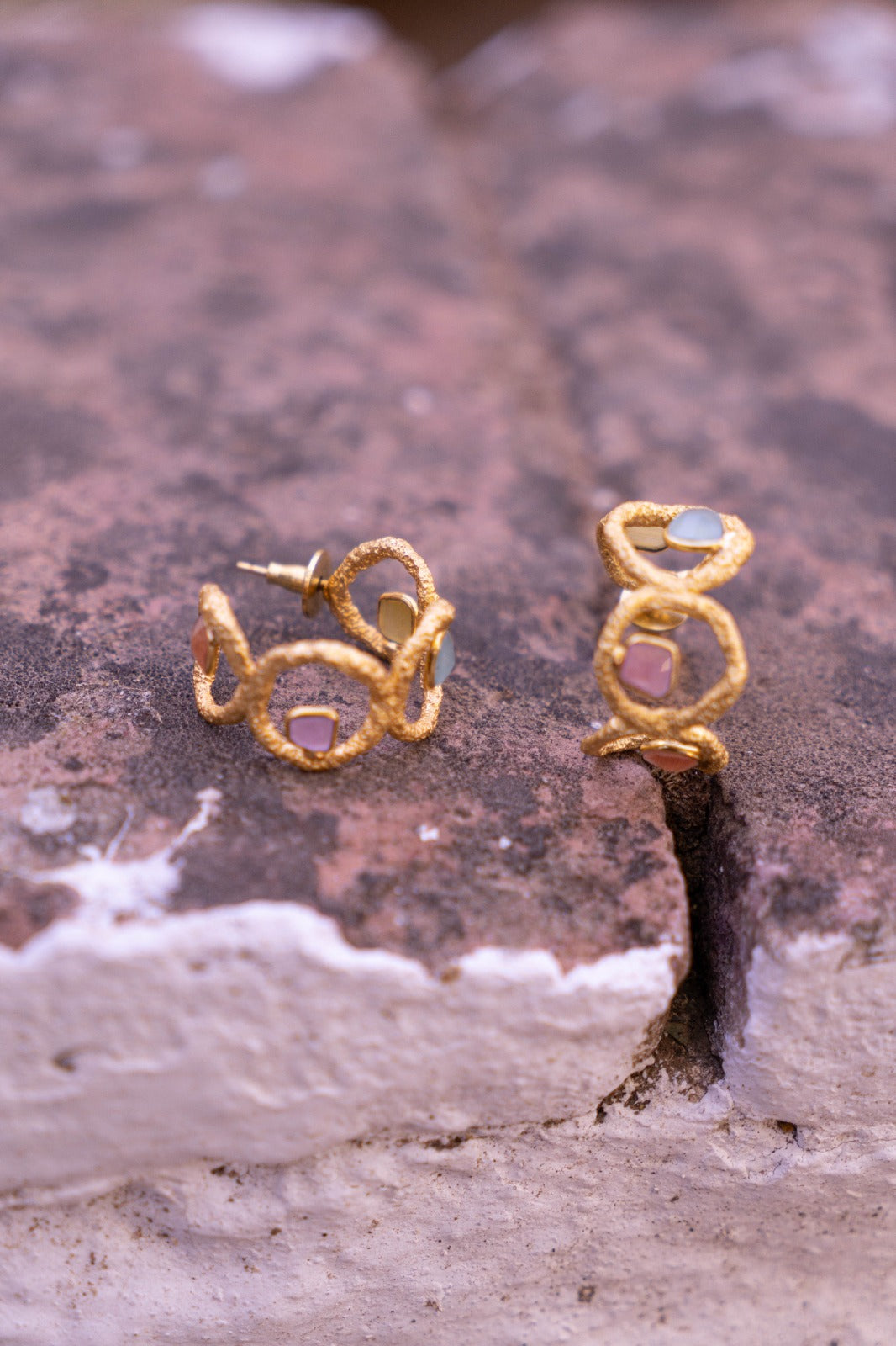 Pendientes en forma de varias circunferencias unidas creando un aro. Dentro de cada una de ellas, se sitúa una piedra de un color diferente.