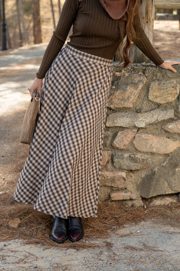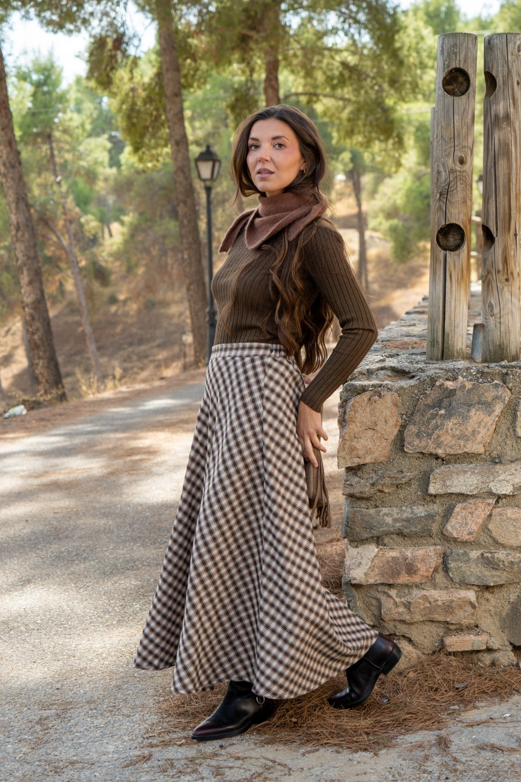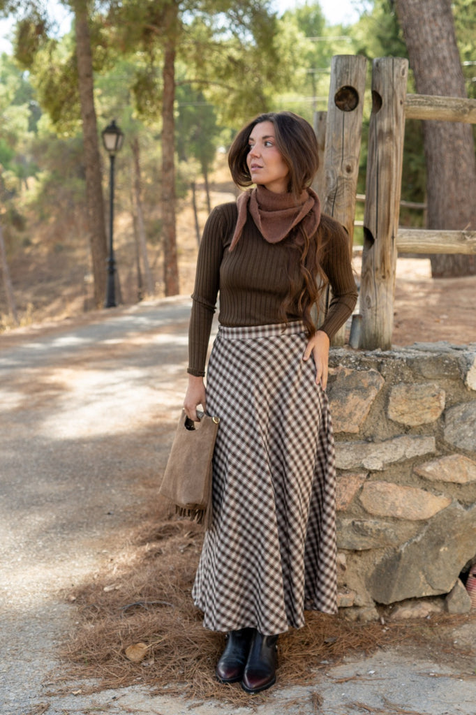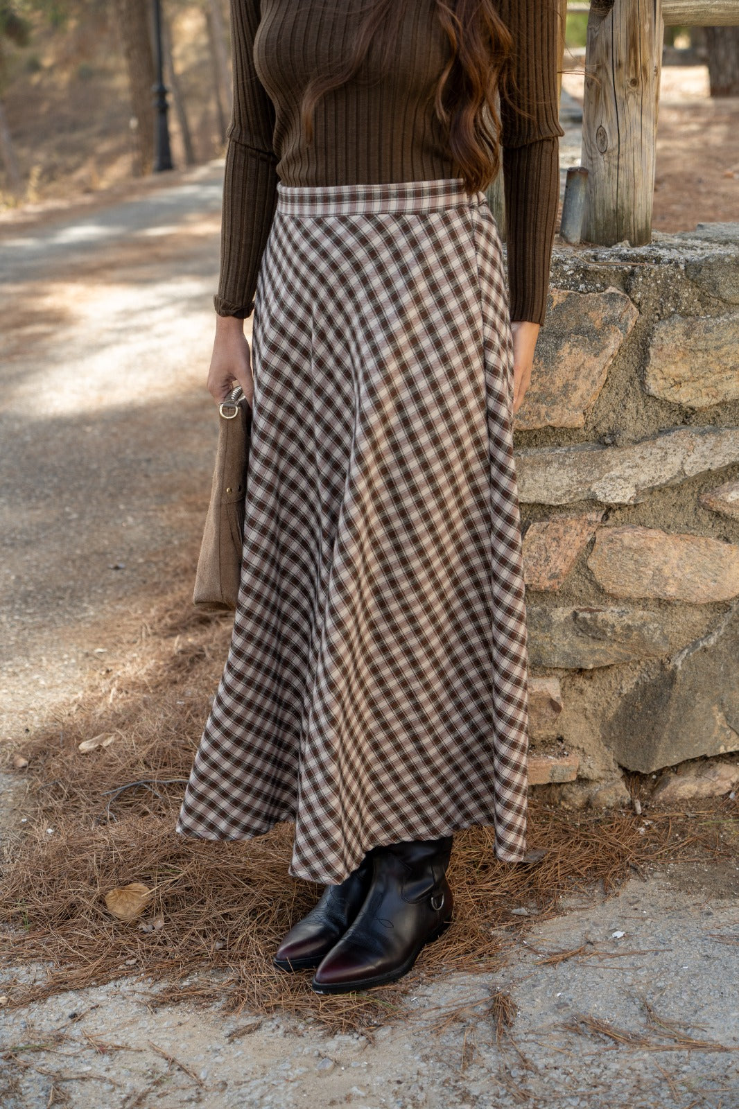 Falda midi, goma en la parte trasera de la cintura, evase, en cuadros pequeños camel y beige.