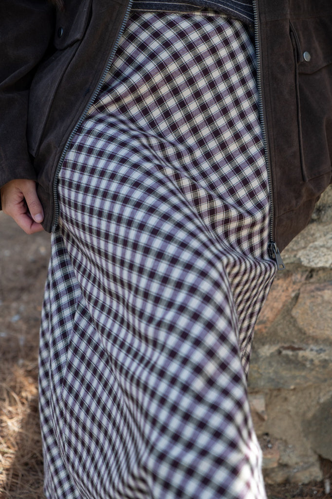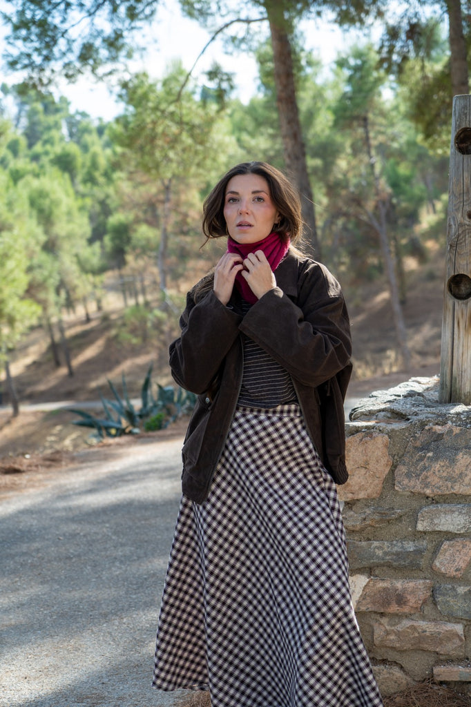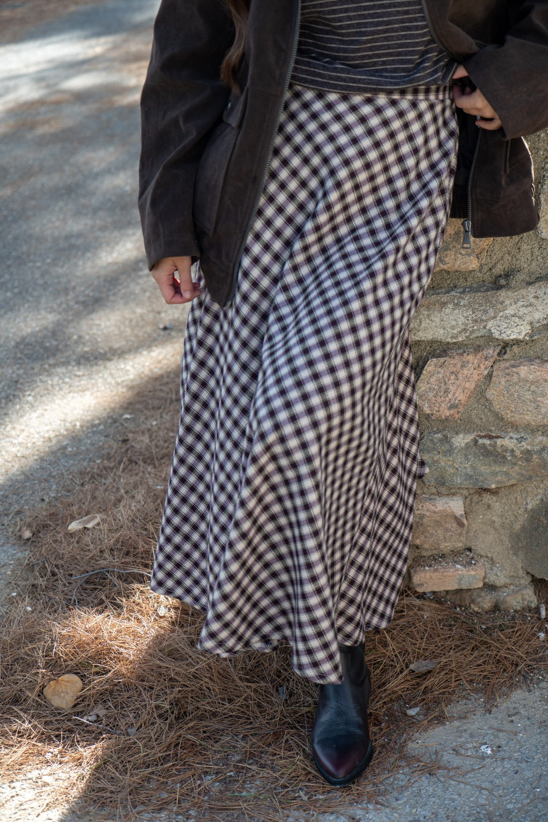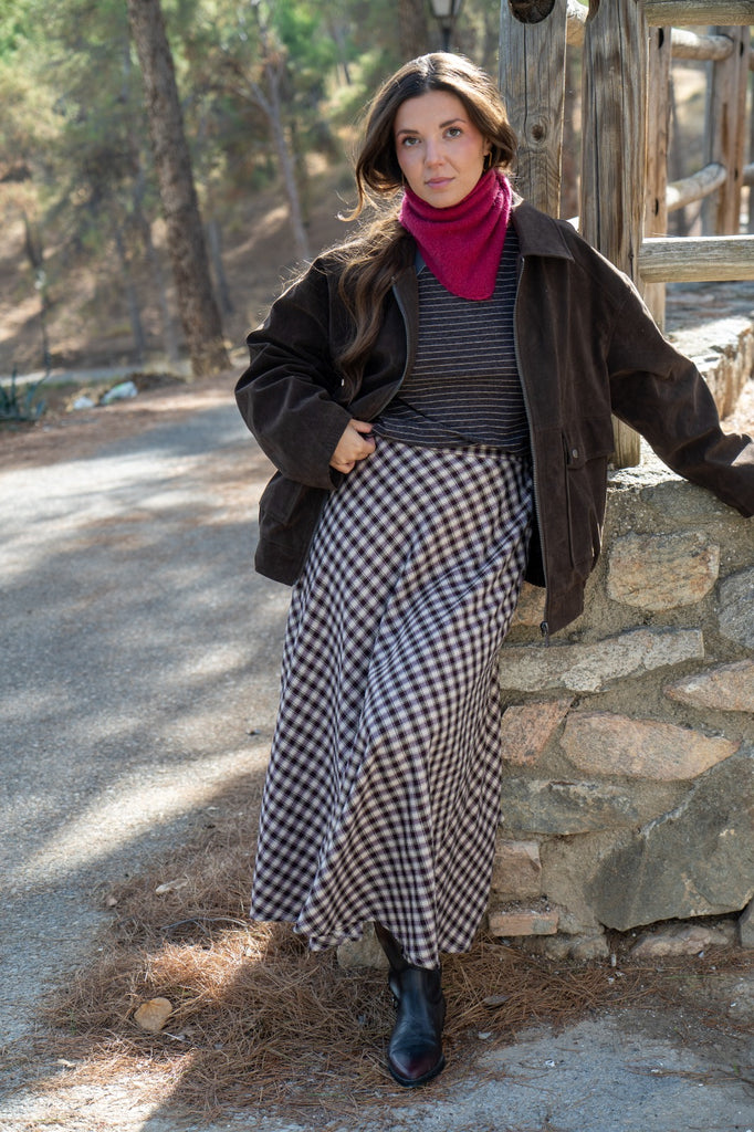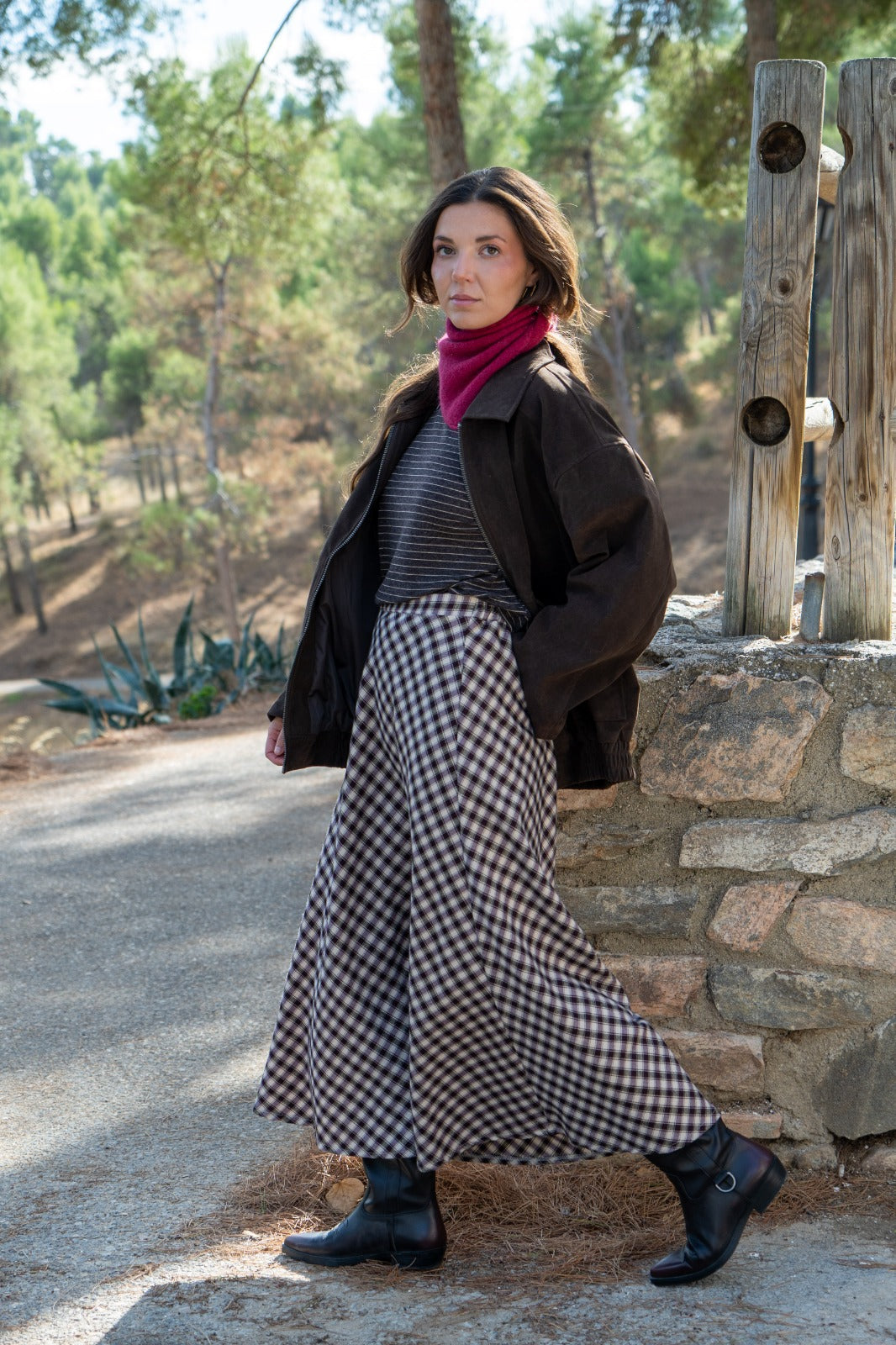 Falda midi, goma en la parte trasera de la cintura, evase, en cuadros pequeños berenjena y beige.