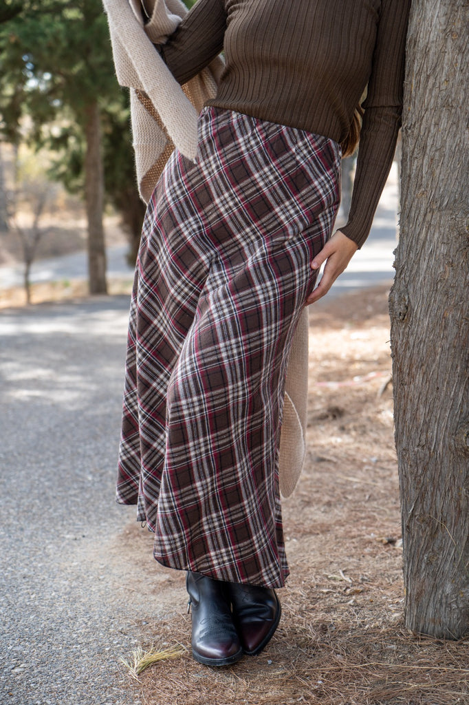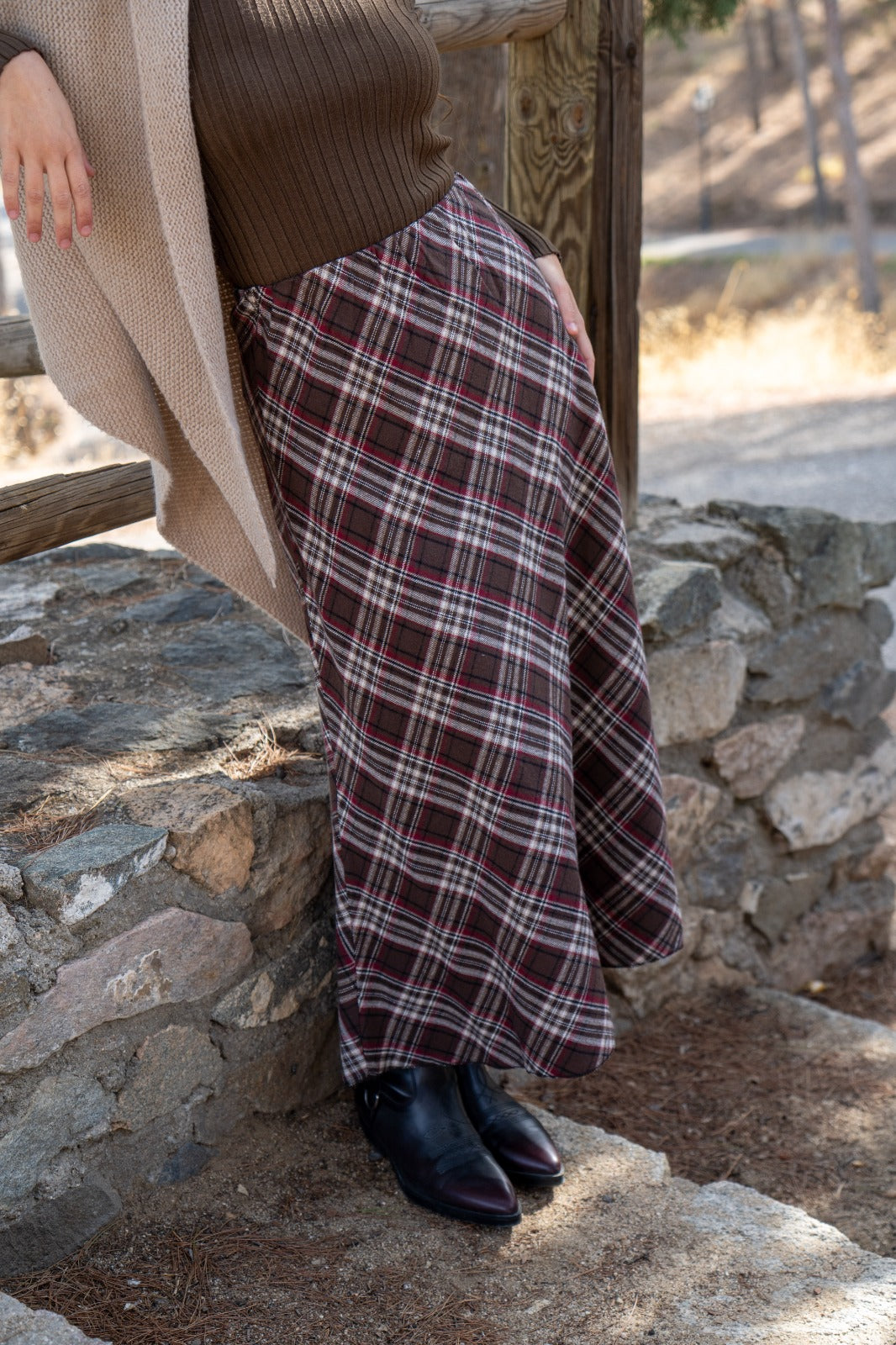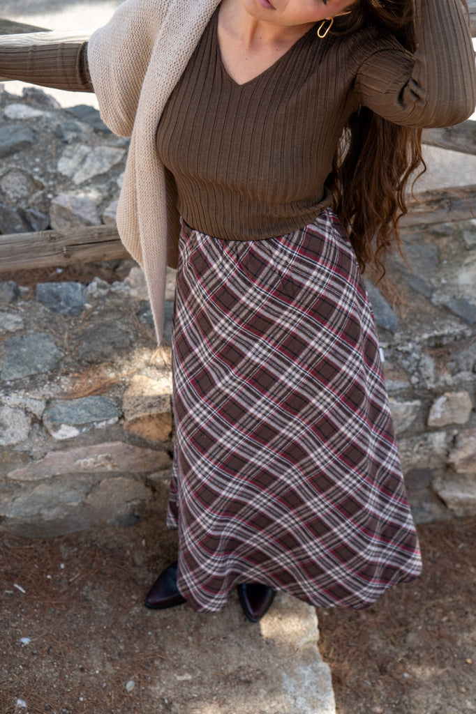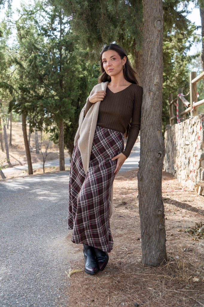 Falda midi, cintura engomada, en cuadros marrones, rojo y beige.