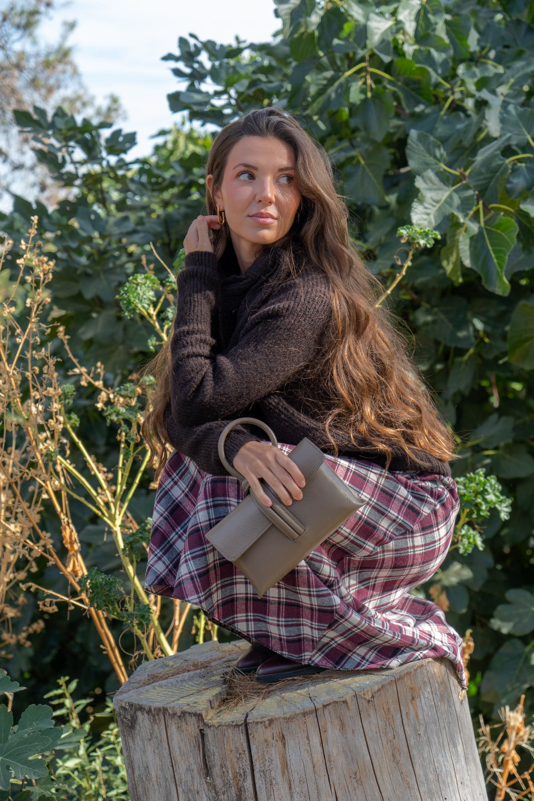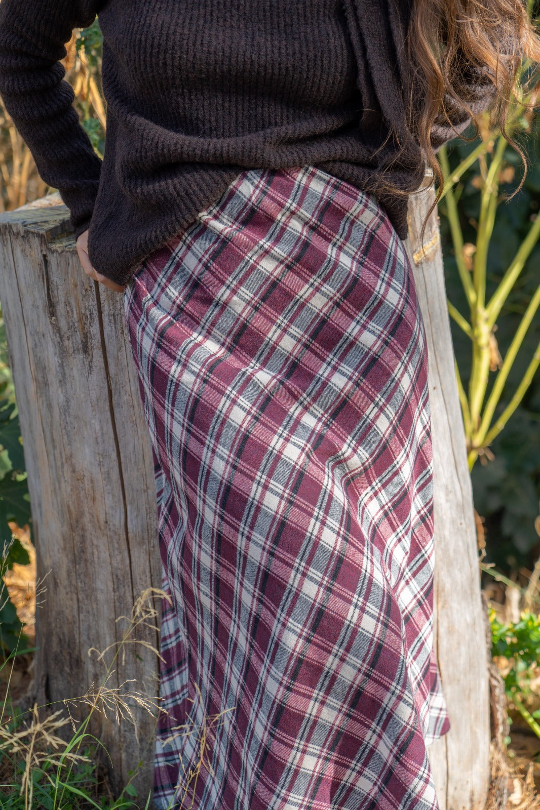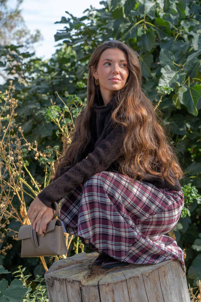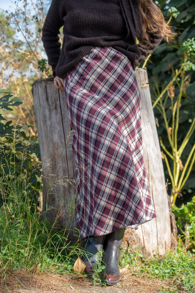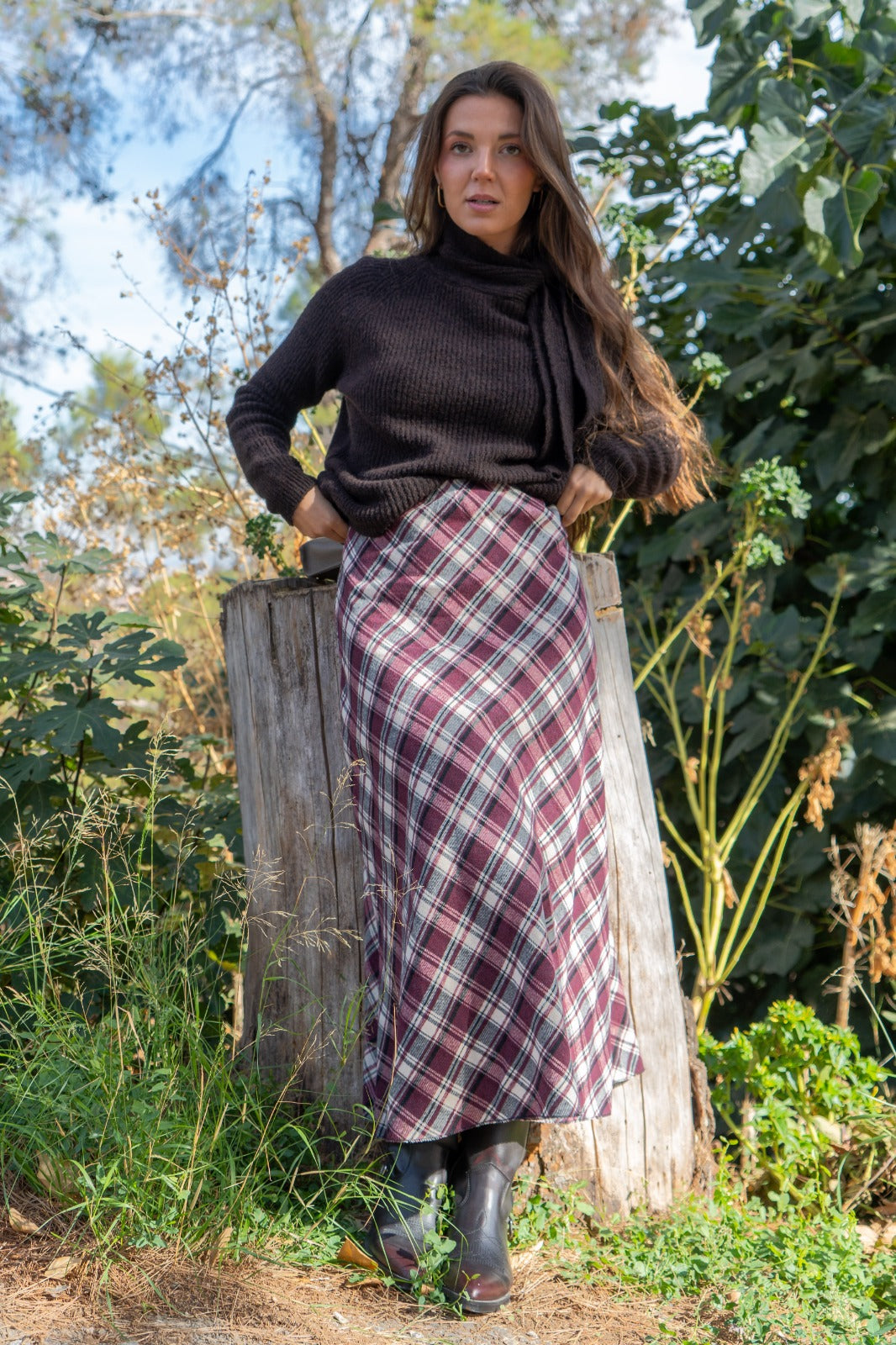 Falda midi, cintura engomada, en cuadros berenjena, gris y beige.