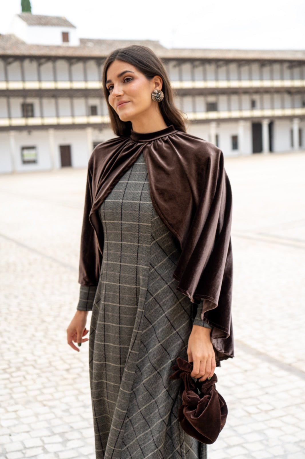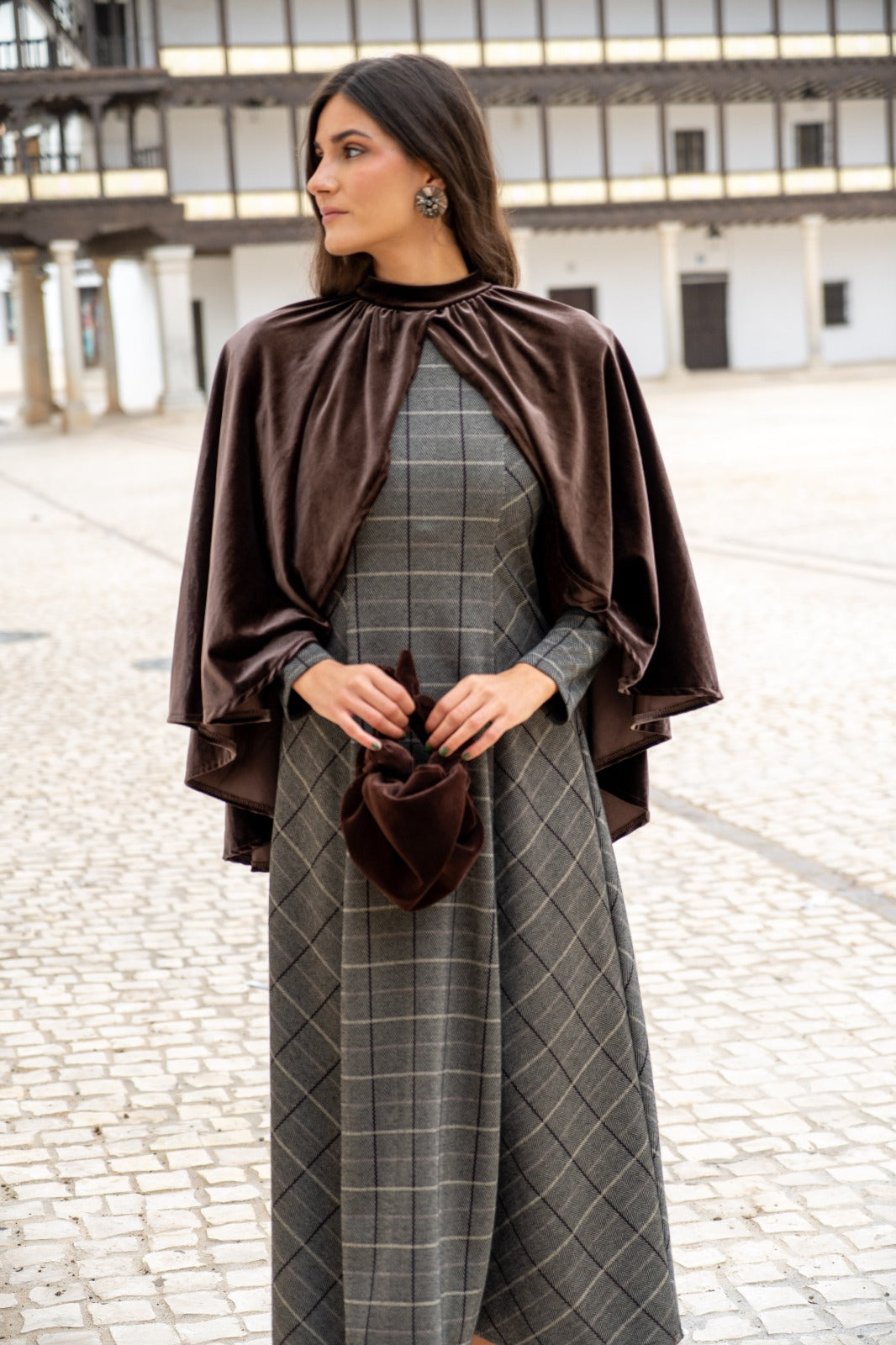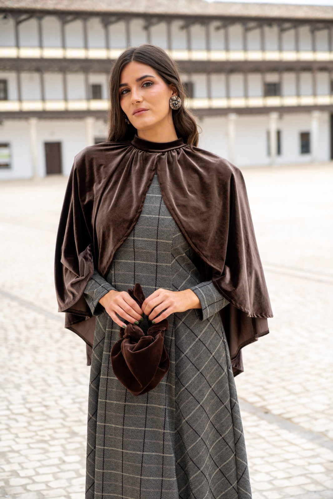 Capa corta, en terciopelo, cuello perkins, abierta en la parte delantera, cerrada por la parte trasera, abrochada con dos botones. En color marron.