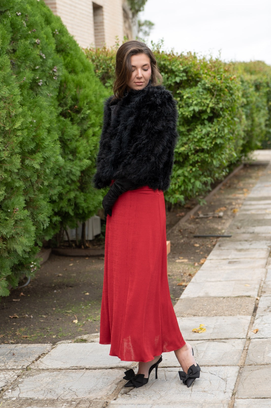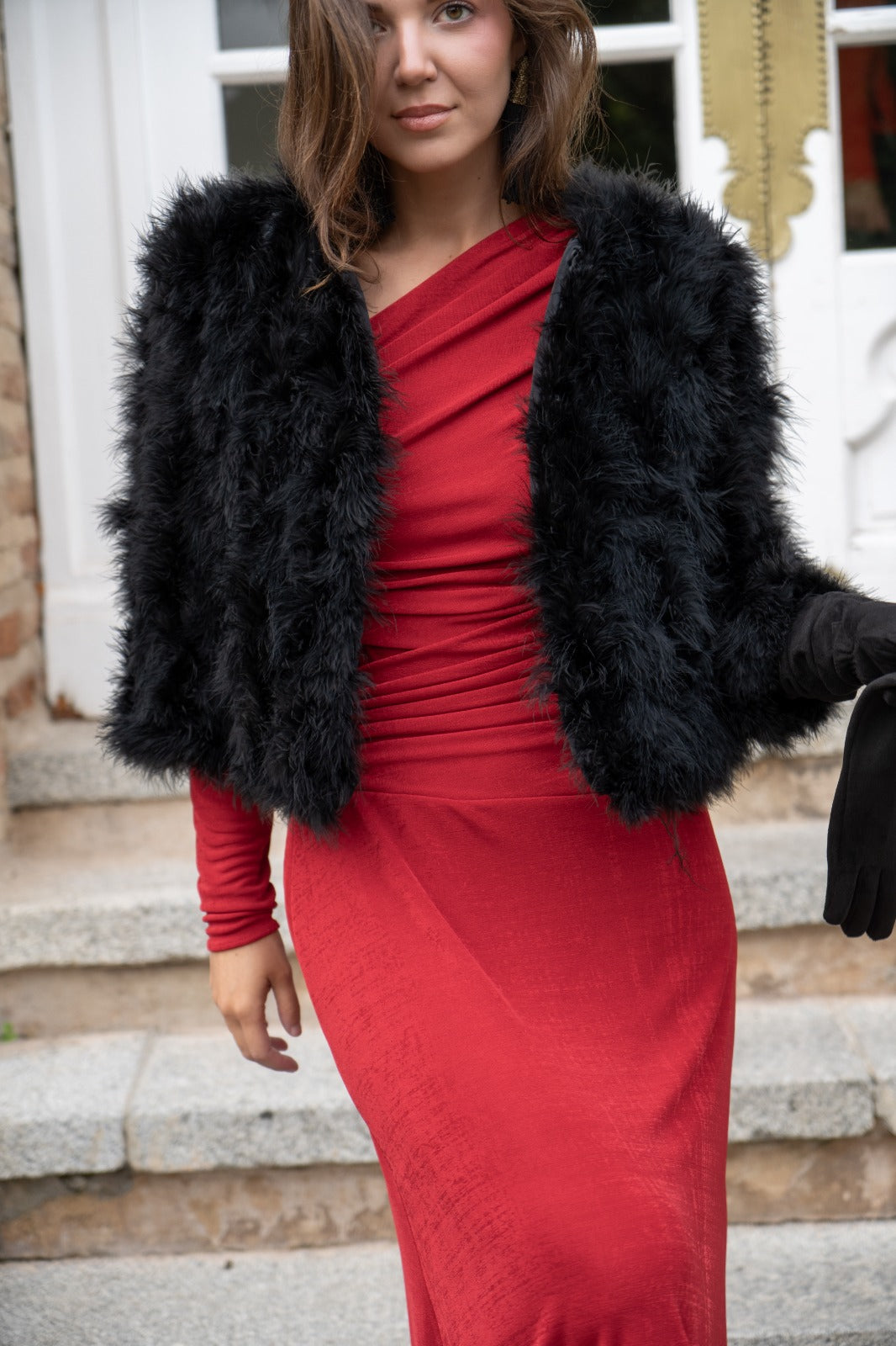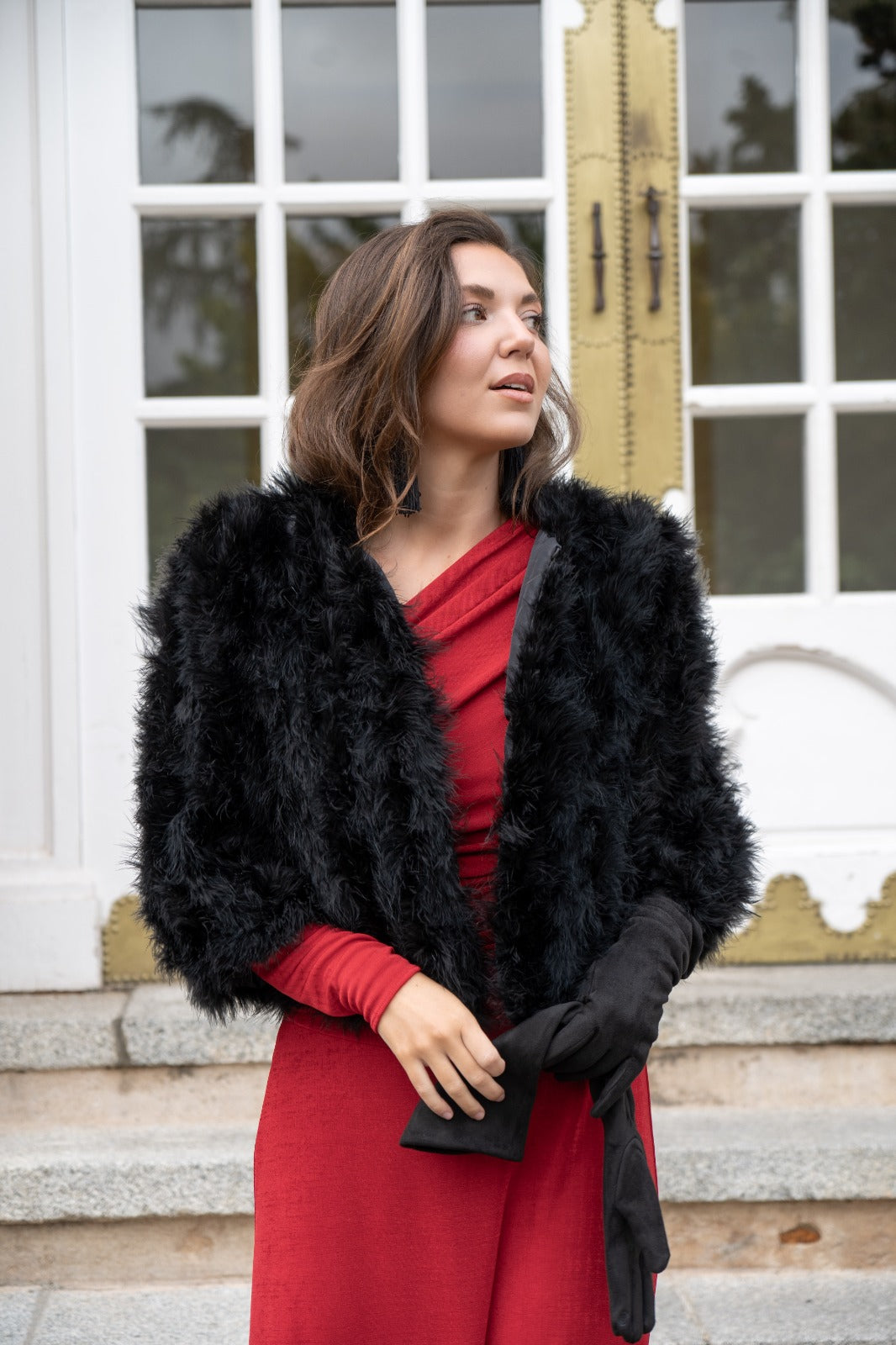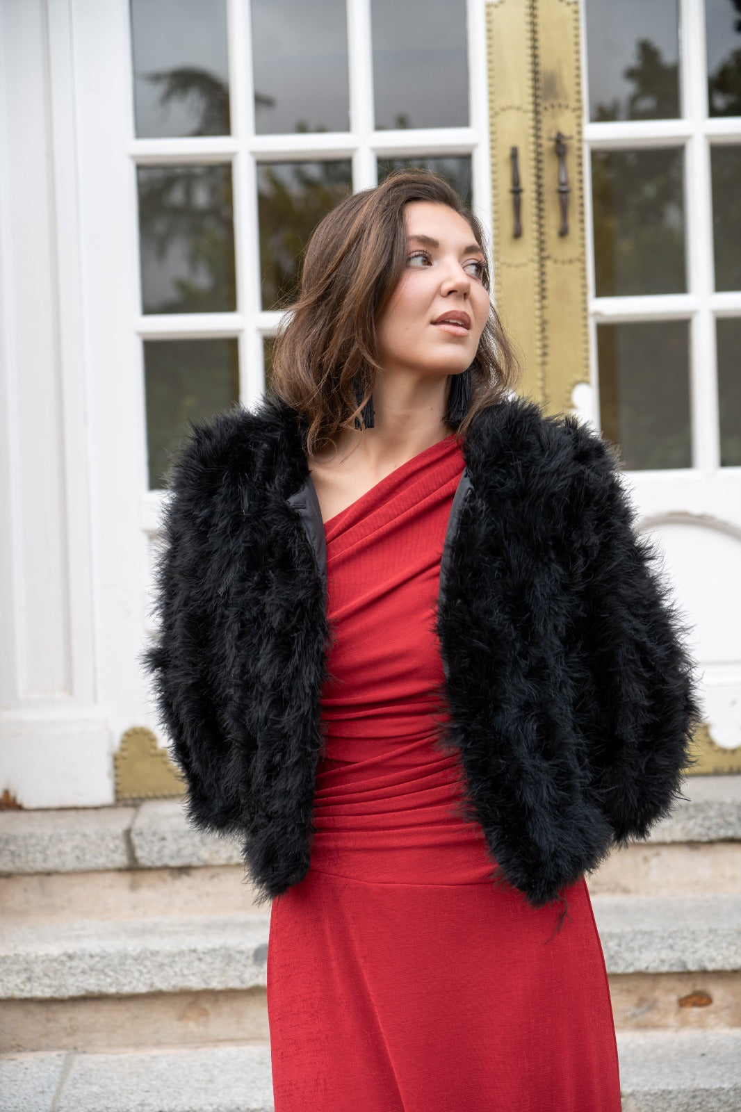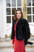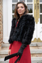 Chaqueta corta, cuello redondo, bolsillos laterales, en marabú color negro.