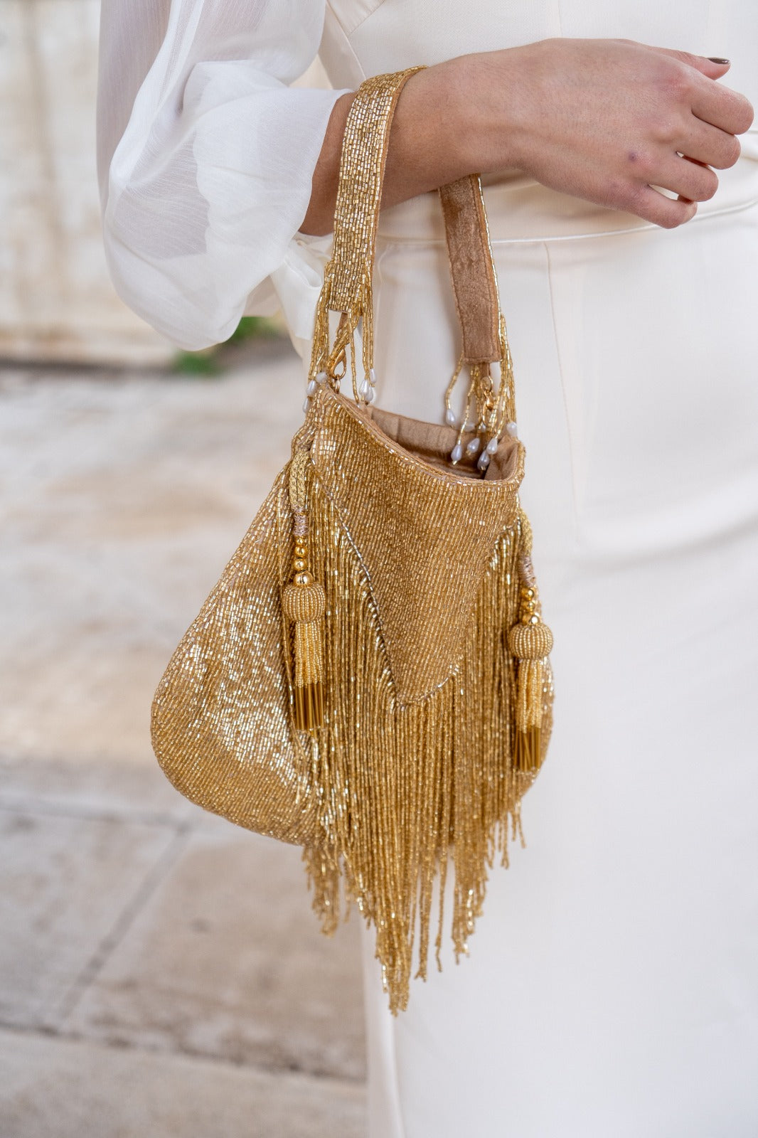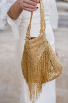 Bombonera dorada, compuesta por abalorios, asa corta, igual por delante y detras.