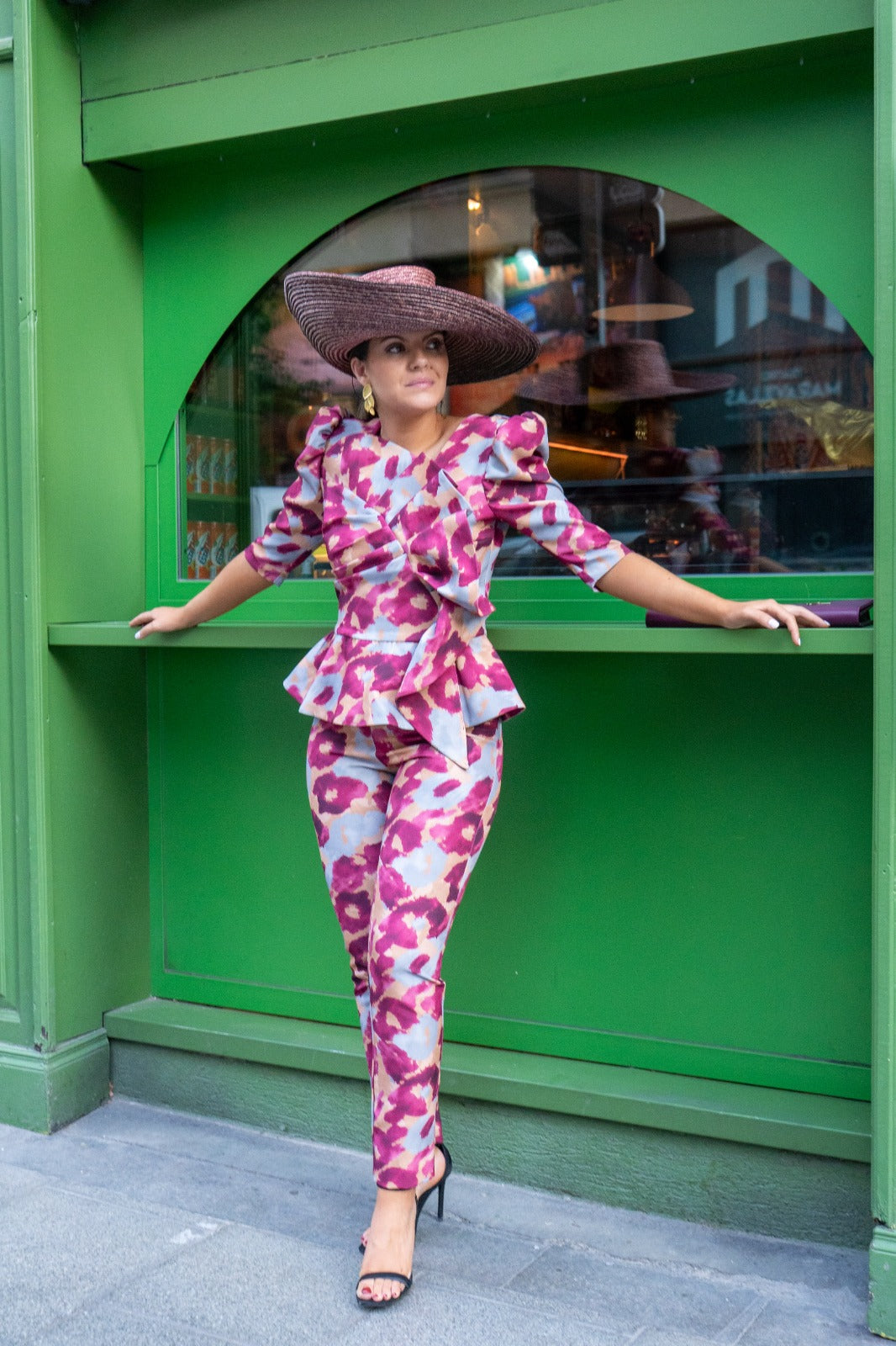 Conjunto compuesto por top escote redondo, manga francesa, lazo delantero, volante abajo y pantalon cintura alta, estrecho, cremallera trasera top y pantalon. En color estampado.