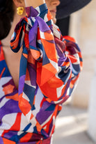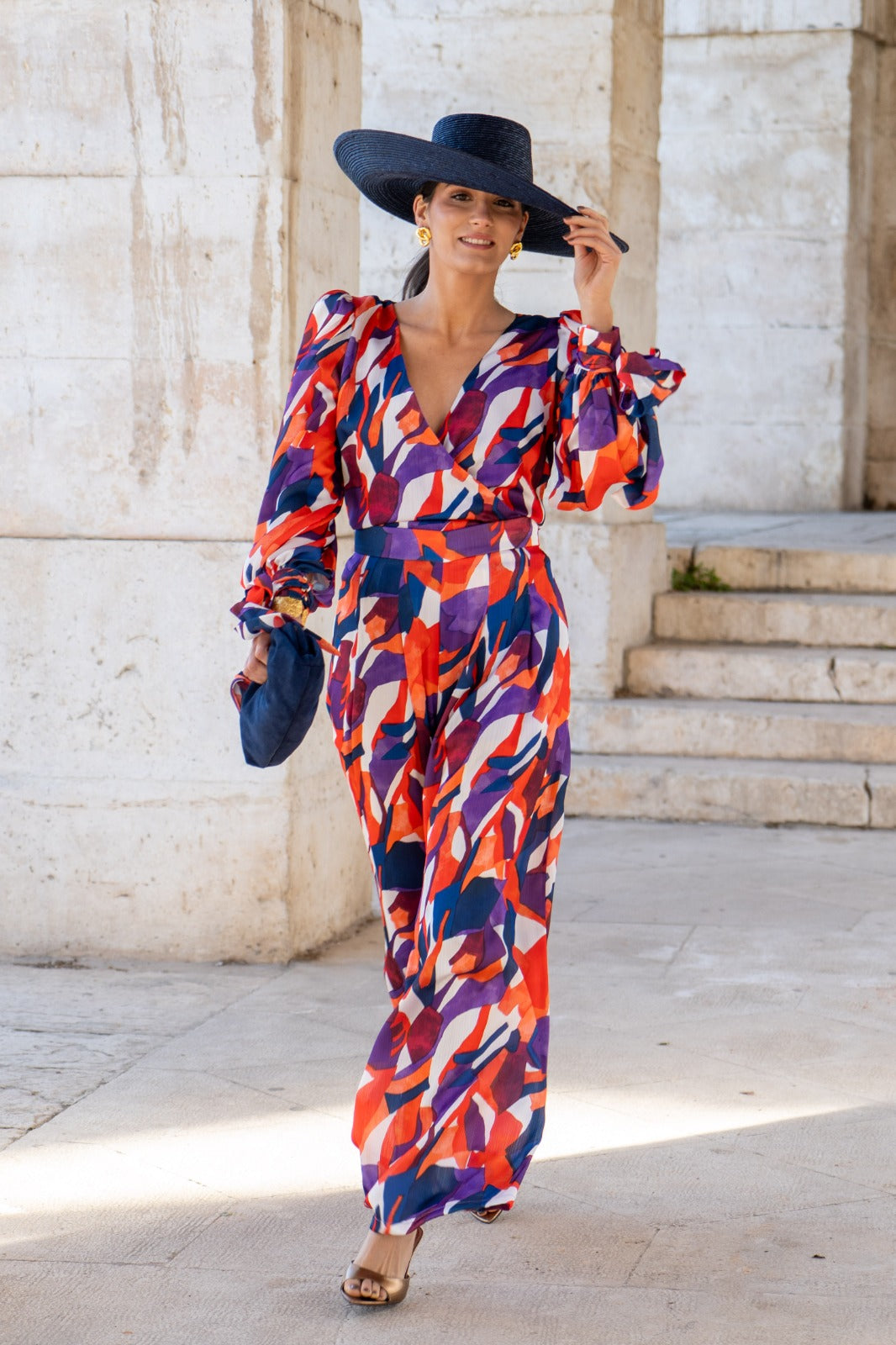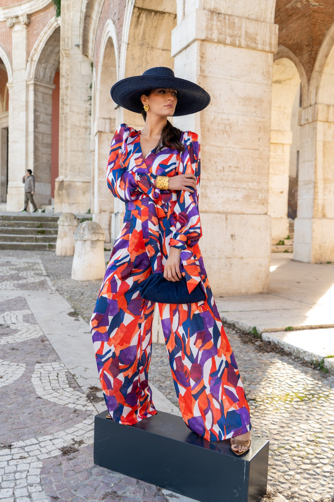Conjunto compuesto por blusa escote cruzado manga larga con lazo en puños y pantalón tiro alto, palazzo. En colores estampado.