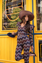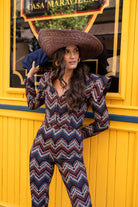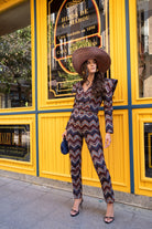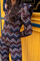 Conjunto compuesto por chaqueta manga larga, alerones en hombro, escote a pico, abrochada delante y pantalón tiro alto, estrecho. En estampado multicolor.