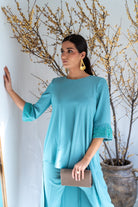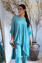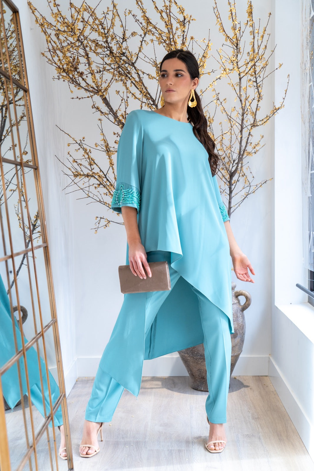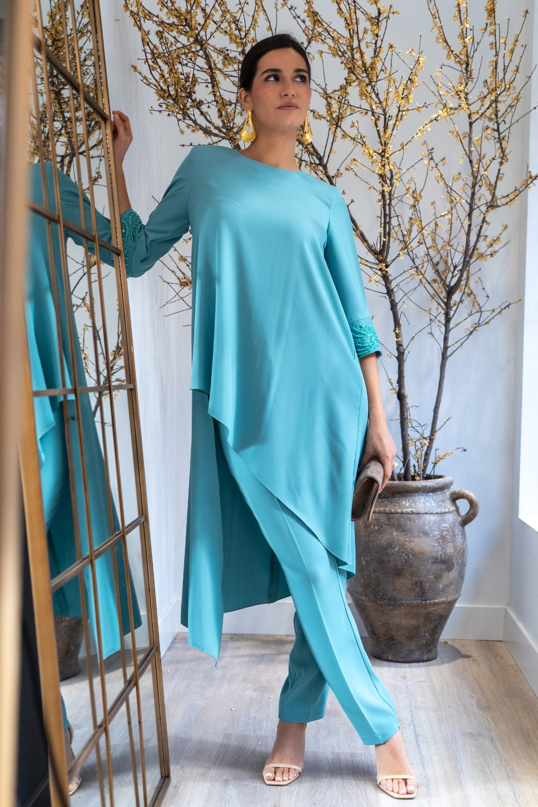 Conjunto compuesto por casaca asimétrica, escote redondo, manga francesa con detalle pedrería en el puño y pantalón con cintura, estrecho de abajo. En color azul.