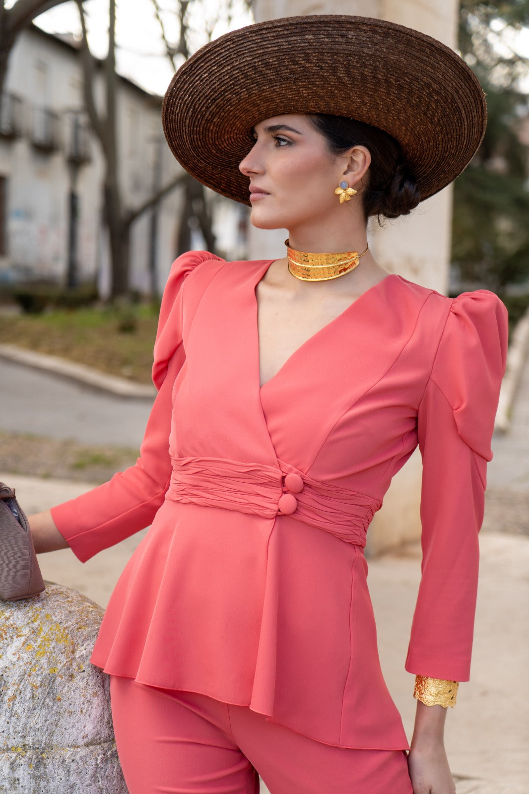 Conjunto compuesto por chaqueta cruzada con botones, manga larga abullonada y pantalón tiro alto, cremallera a un lado en color coral.