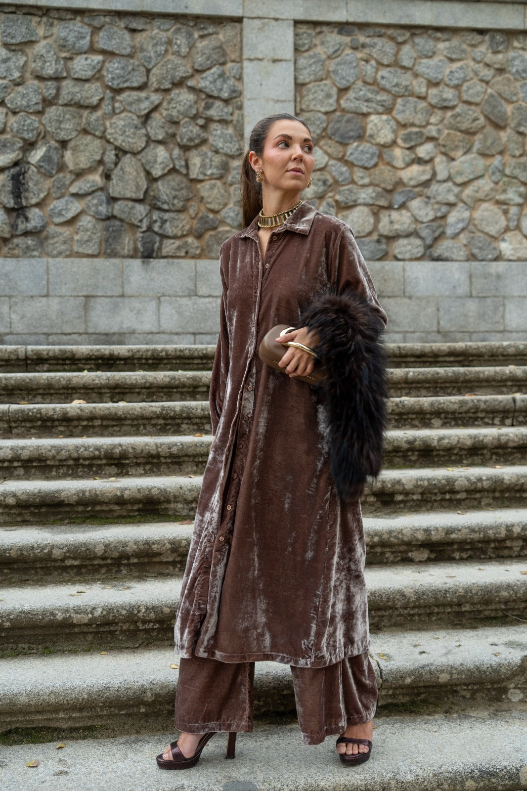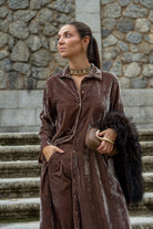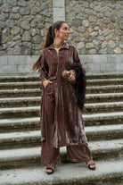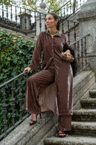 Conjunto formado por kaftan manga larga, abotonado y pantalón cintura engomada, bolsillos laterales. En color topo.