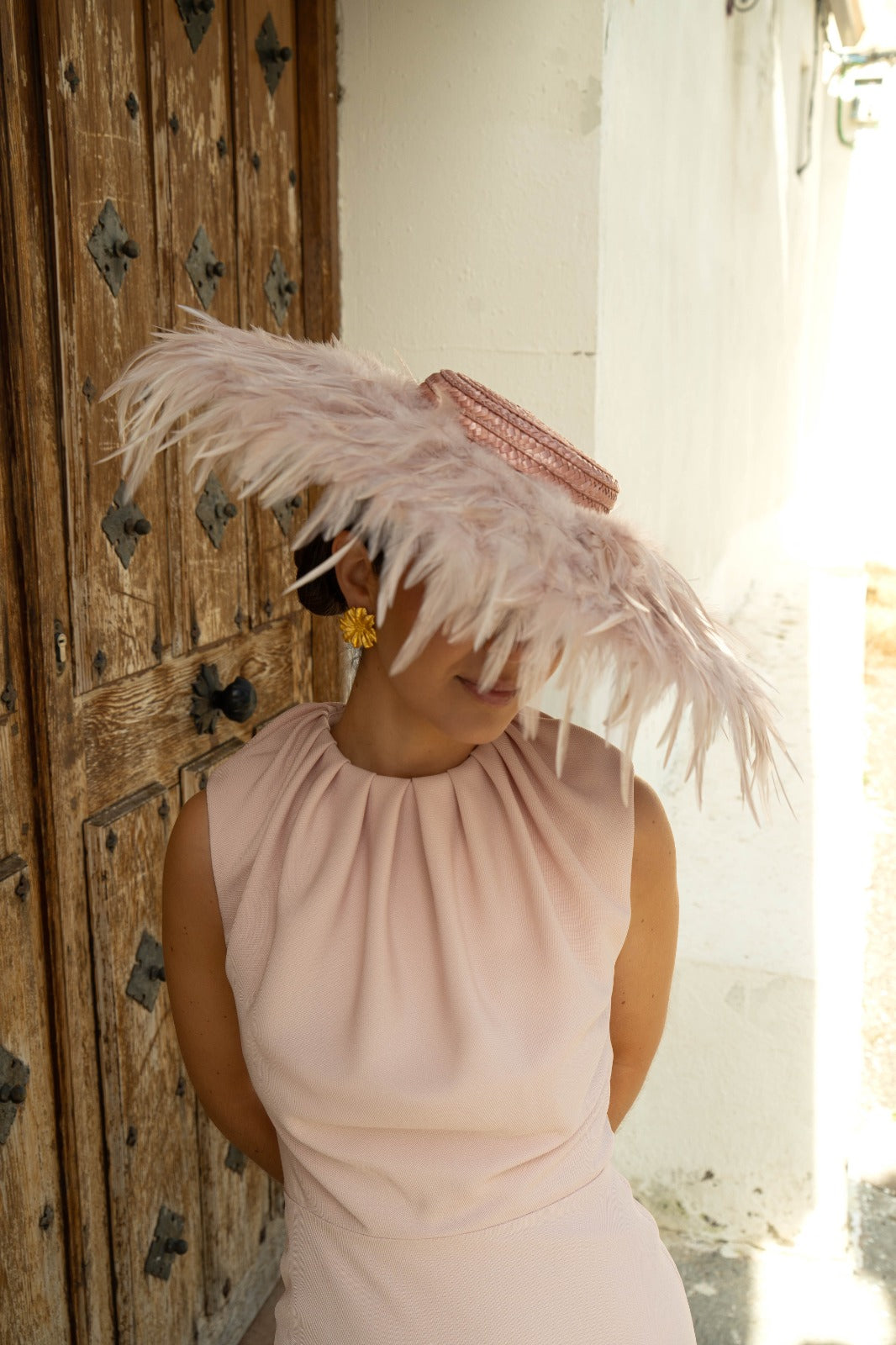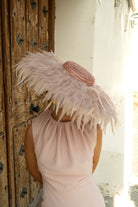 Pamela base redonda, lleva todo el ala forrada con plumas de gallo, con diadema para sujetar, en color rosa.
