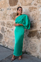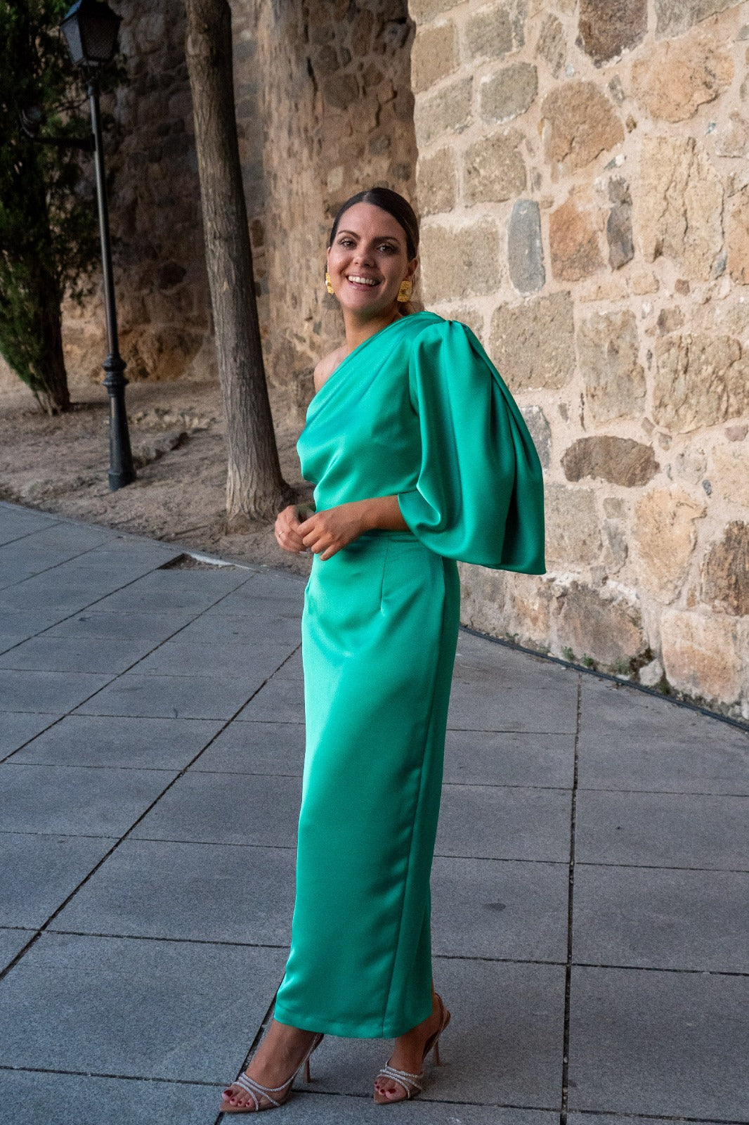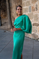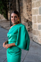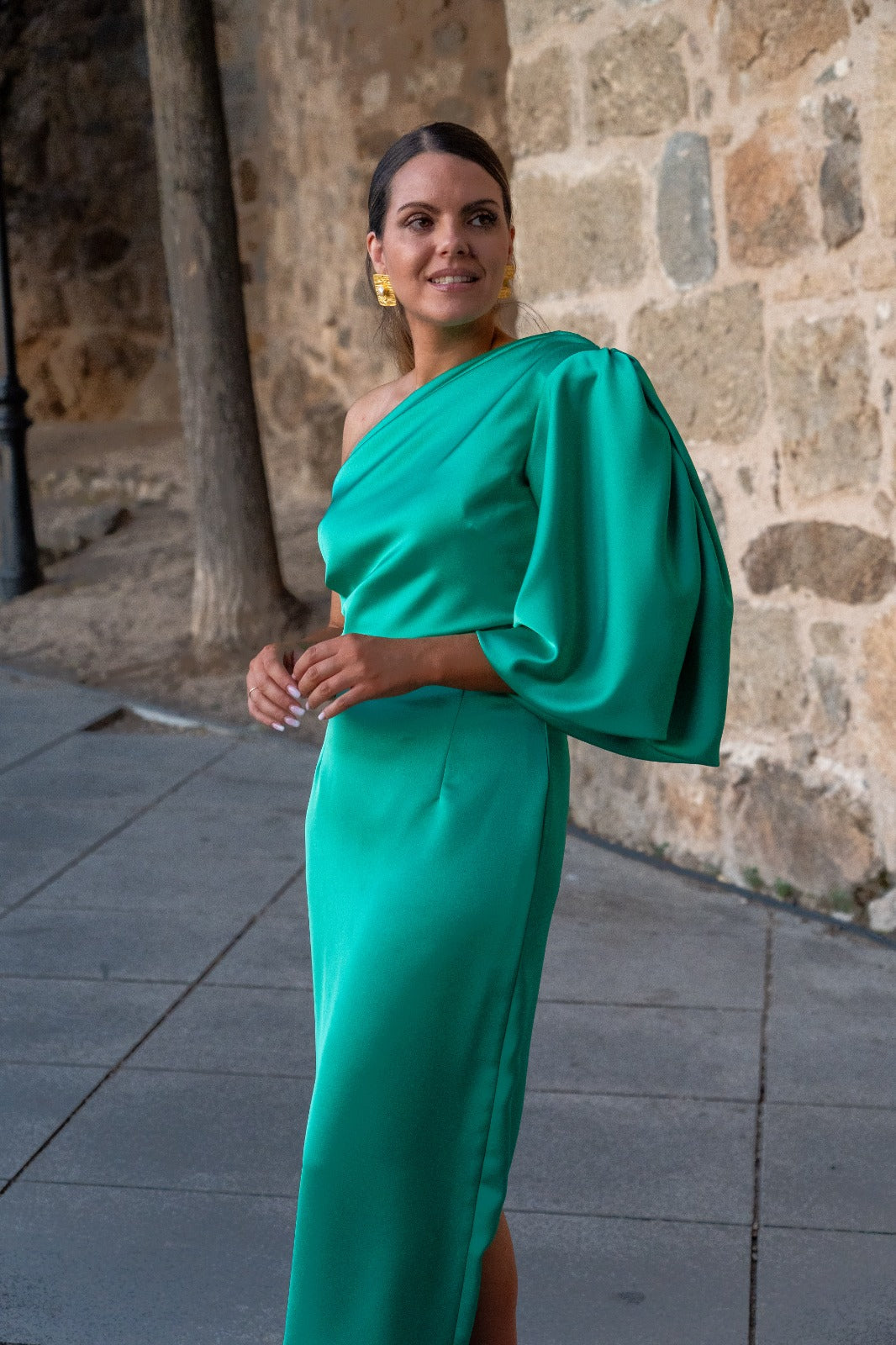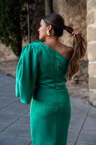 Vestido midi, asimetrico en un lado, manga corta fruncida y ancha en otro hombro, corte en cintura y abertura trasera. En color verde.