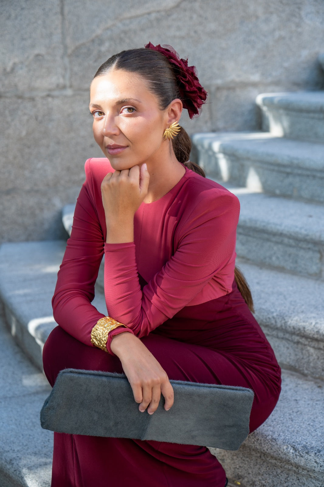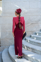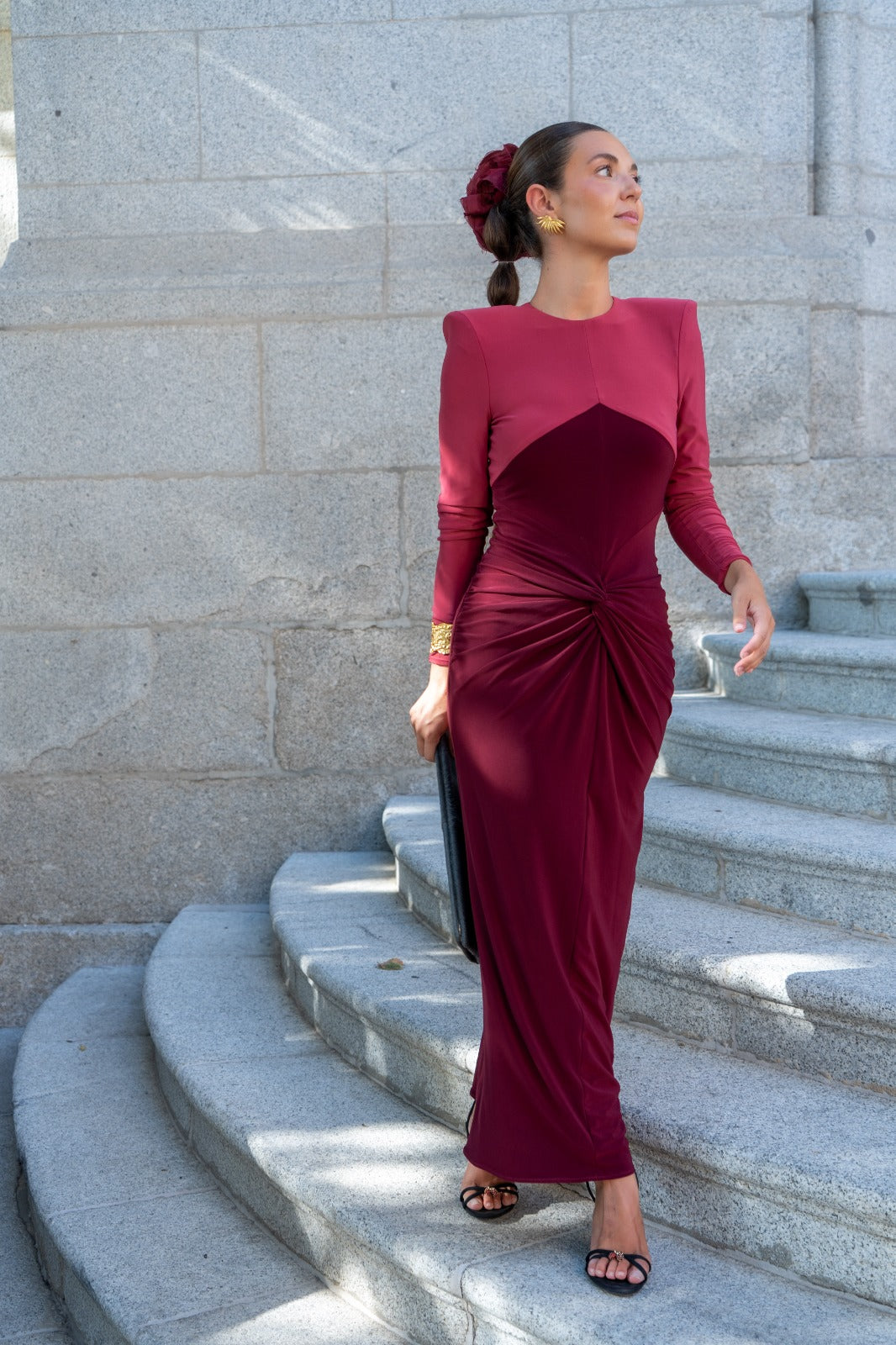 Vestido midi, escote redondo, hombros marcados, manga larga, nudo en cintura. En punto bicolor rosa y burdeos.