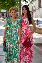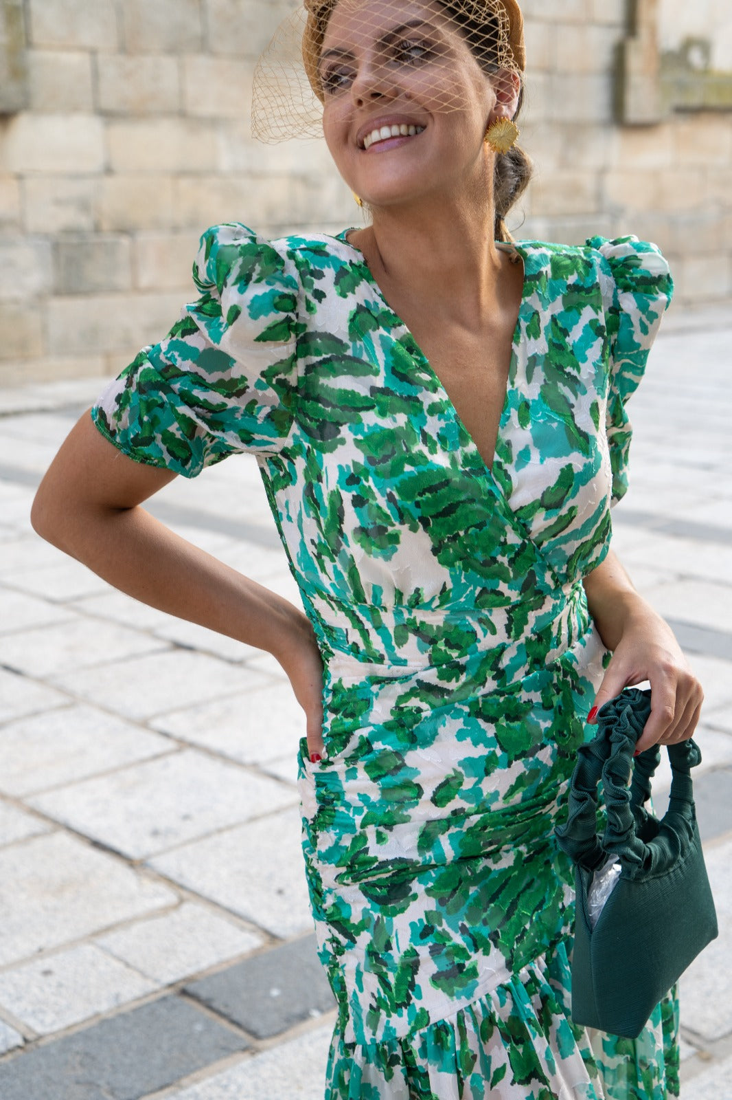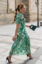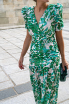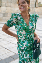 Vestido midi, escote a pico, manga corta, fruncido en cintura, volante abajo. Estampado verde y blanco.