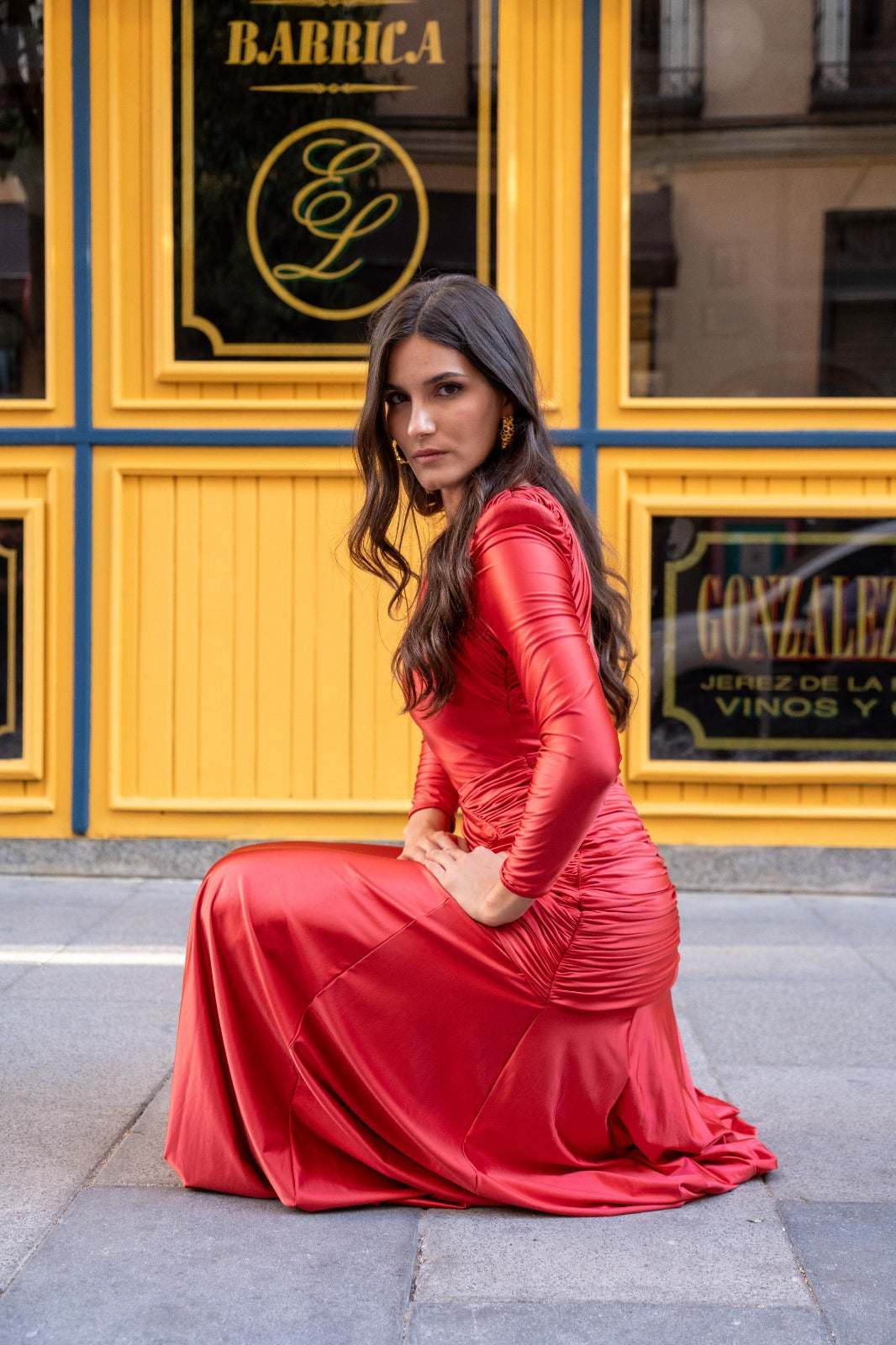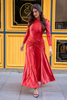 Vestido midi, escote redondo, escote trasero, manga larga, drapeado en diferentes direcciones que envuelven el cuerpo, parte de abajo en capa. En color rojo con efecto metalico.