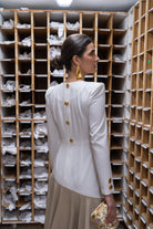 Vestido midi, escote redondo, manga francesa, detalles botones dorado traseros y puños, falda con movimiento. Bicolor blanco y beige.