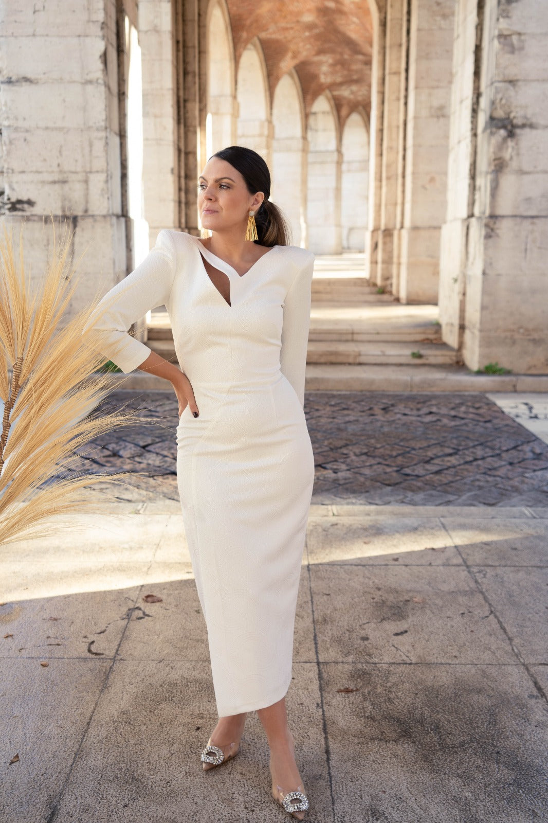Vestido midi, escote a pico y pequeña abertura a un lado, manga francesa, abertura delantera a un lado. En color blanco con dibujo y detalla en lurex plata.