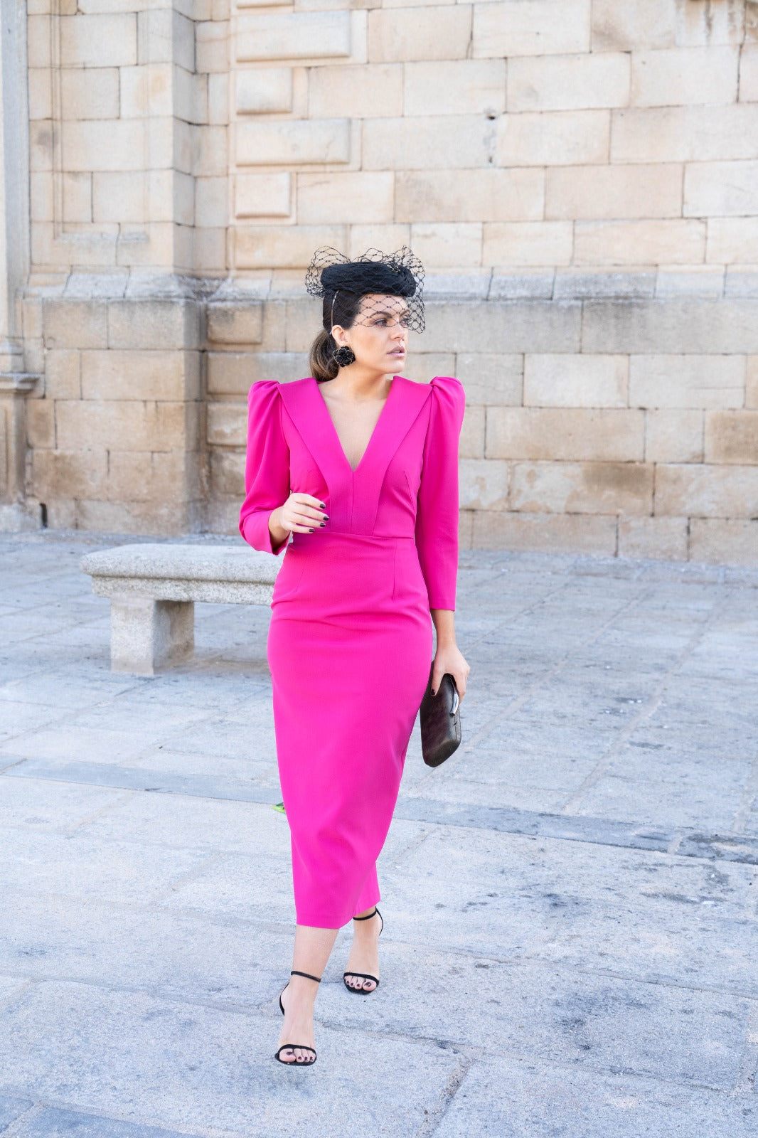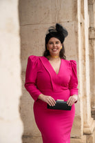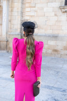 Vestido midi, escote a pico con cuello solapa, manga abullonada, abertura trasera. En color rosa.