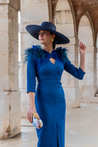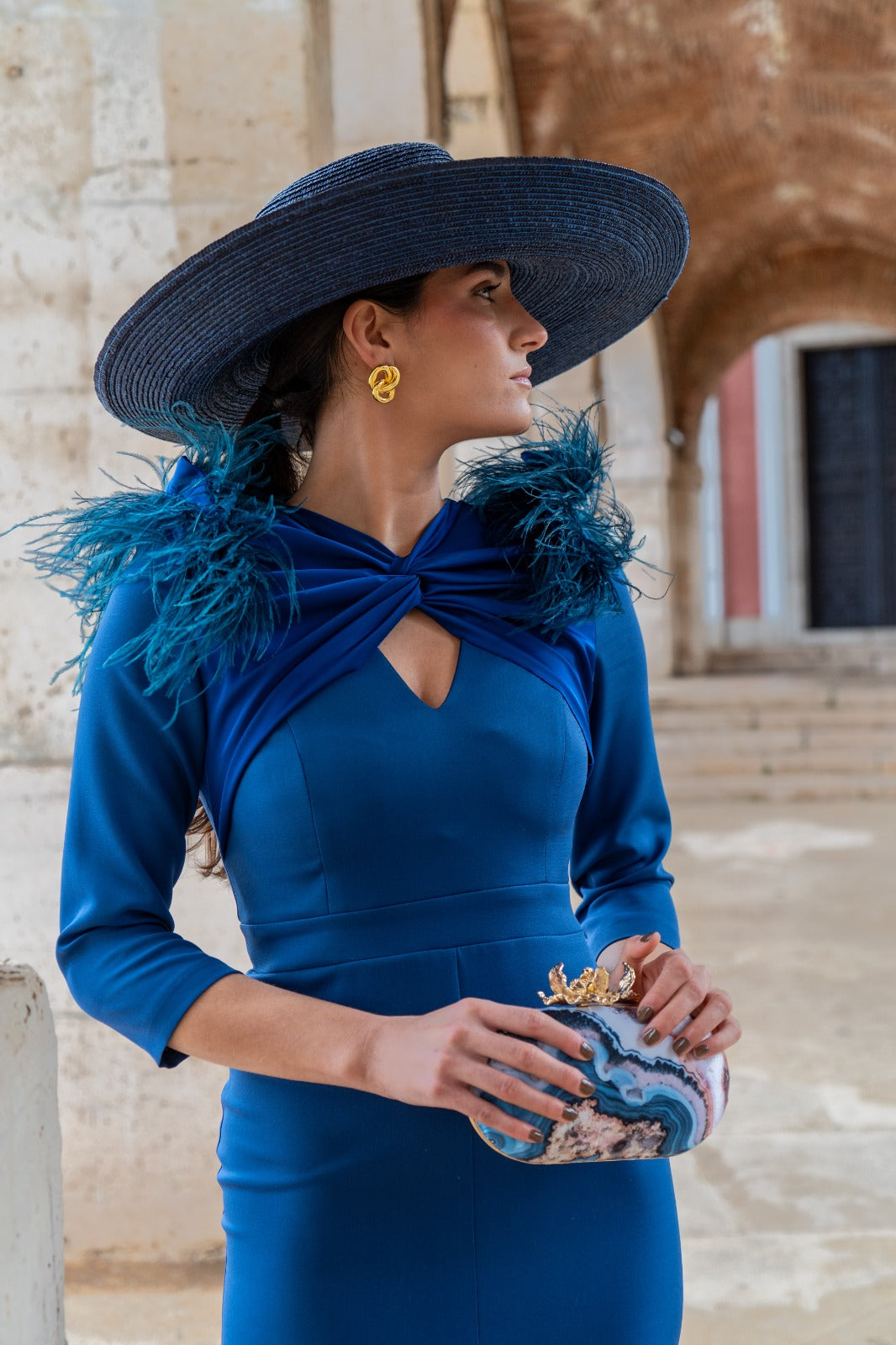 Vestido midi, manga francesa, escote con nudo y lagrima, detalle plumas en hombros, abertura delantera. En color azul.