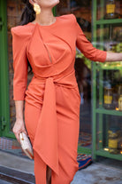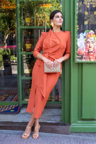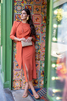 Vestido midi, escote redondo, manga larga con detalles botones, hoja en el pecho, cinturon y abertura a un lado. En color teja.