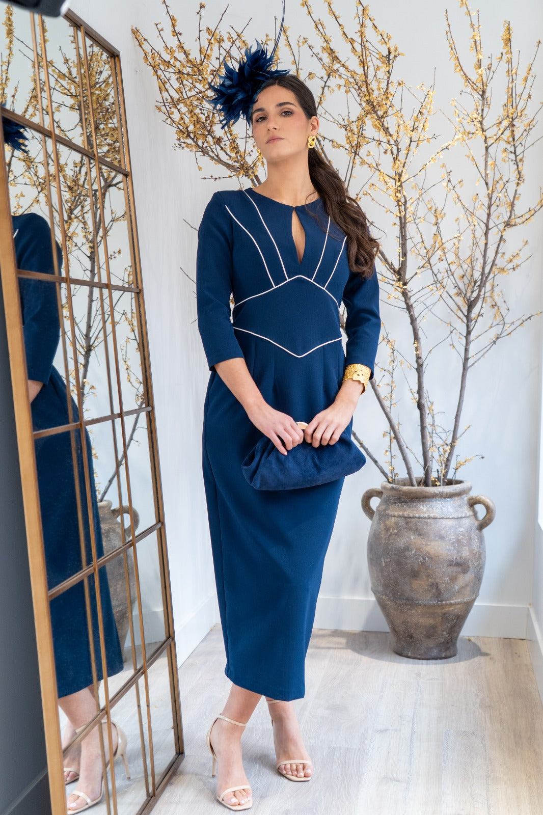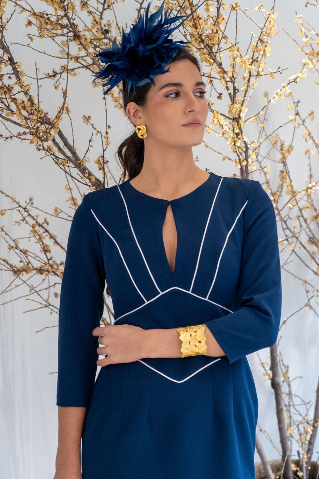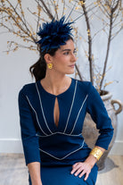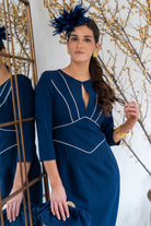Vestido midi, escote redondo, con lagrima en el centro, manga francesa, abertura trasera. En color marino con detalle en color blanco.