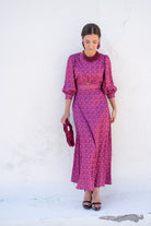 Vestido midi, escote redondo, manga francesa con puño, cut out delantero, goma en cintura trasera, falda evase. Estampado en tonos morados.