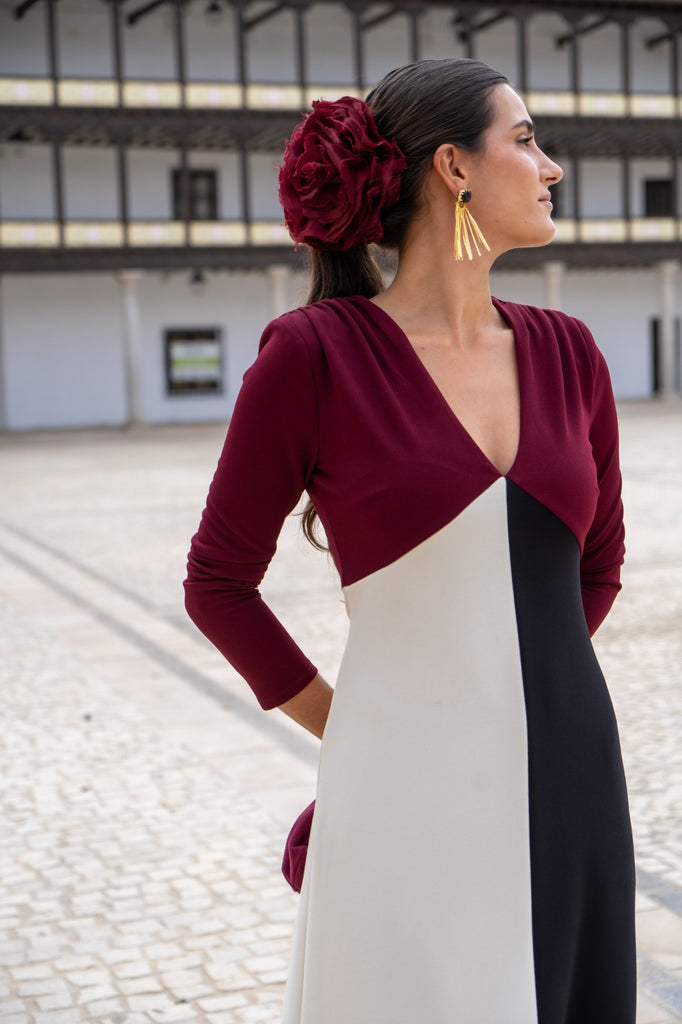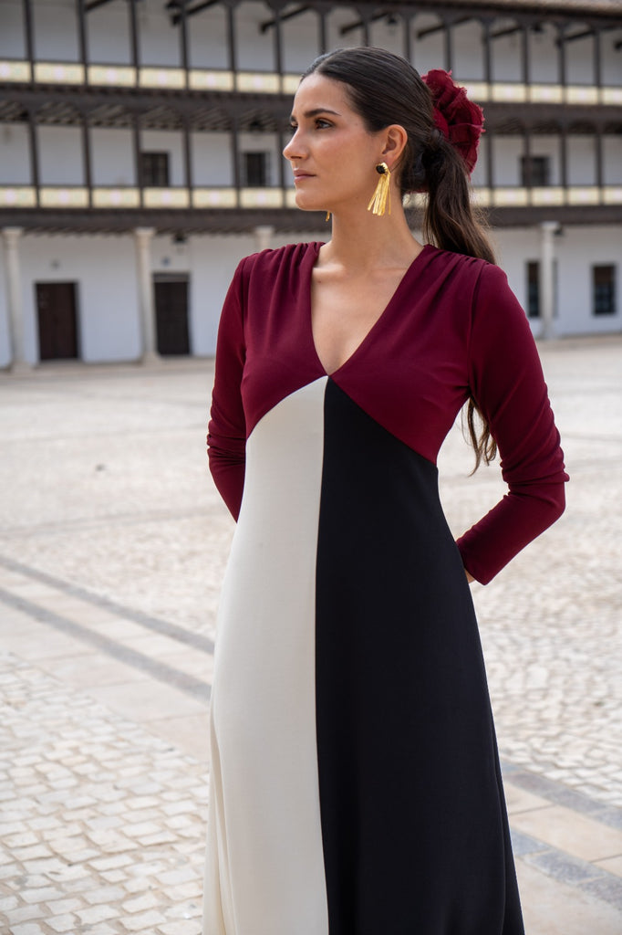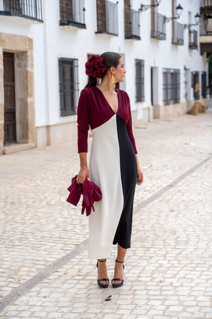 Vestido midi, escote a pico, manga francesa, hombros fruncidos, abertura delantera. Tricolor burdeos, blanco y negro.
